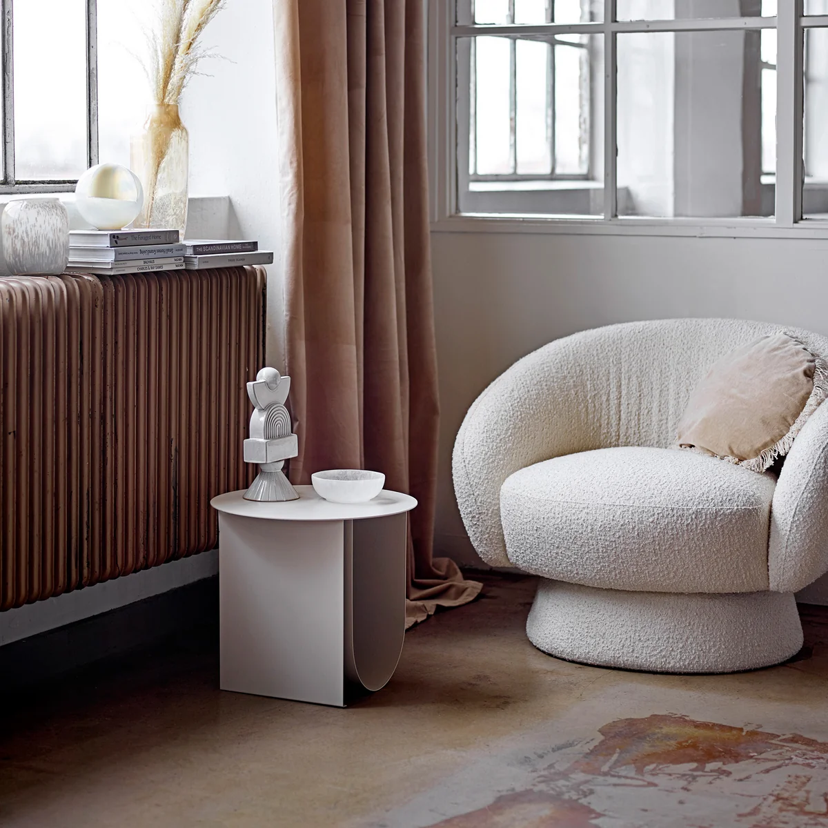 La table d'appoint Cher est fabriquée en métal et revêtue par poudre dans un ton gris discret. Elle est conçue pour supporter une charge maximale de 10 kilos.