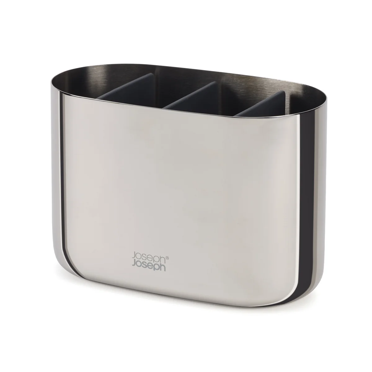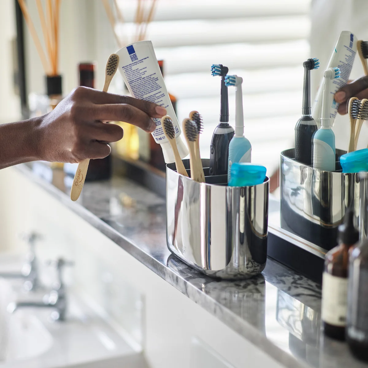 Le porte-brosse à dents EasyStore Luxe du fabricant Joseph Joseph séduit par son design élégant. Le porte-brosse à dents est fabriqué en acier inoxydable poli. Il convient parfaitement pour les brosses à dents, les tubes de dentifrice et les cure-langues. Le porte-brosse à dents est disponible en différentes tailles selon les préférences. Les séparations du support permettent un rangement maximal. Il se démonte facilement pour le nettoyage.