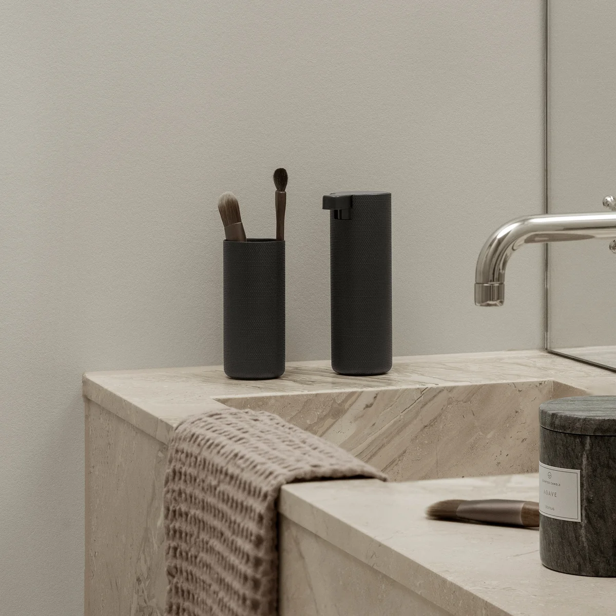 Le distributeur de savon Modo Rof allie un design moderne à une finition de surface luxueuse et apporte une touche de style à la salle de bains. La surface moletée confère au distributeur de savon un toucher agréable et lui donne un aspect raffiné. Le moletage en diamant permet non seulement de valoriser visuellement la surface, mais aussi d'augmenter les propriétés antidérapantes et la résistance du matériau.