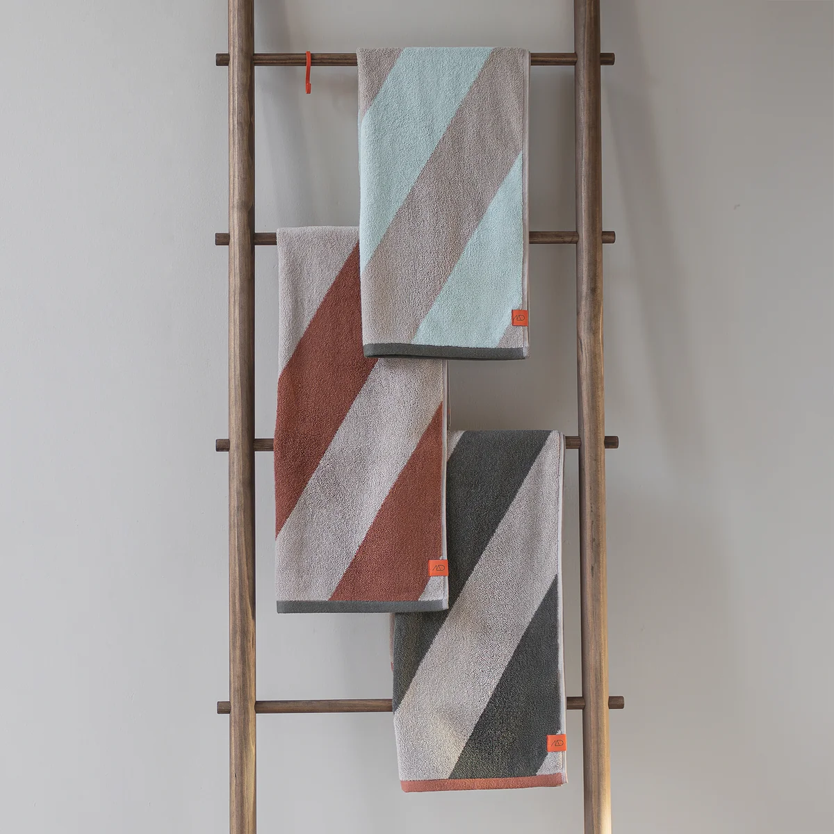 La serviette Diagonal de Mette Ditmer confère une touche de style à la salle de bain. Des rayures diagonales dans des tons chauds apportent chaleur et caractère, tandis que le bord crée un contraste élégant. La boucle orange sert à la fois de détail pratique et décoratif et complète le design moderne.