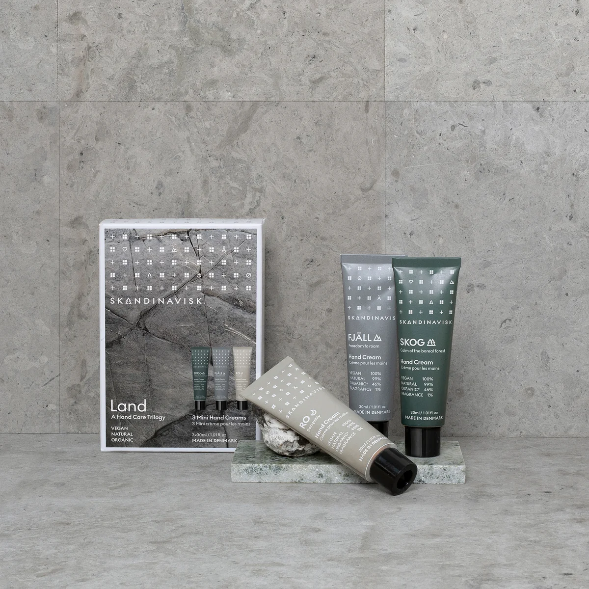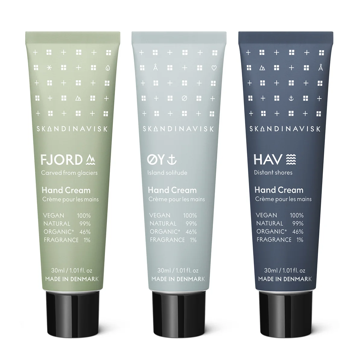 La crème pour les mains de Skandinavisk est fabriquée au Danemark et conditionnée dans un tube métallique recyclable. Le set est disponible en différents parfums et se compose de trois ou six tubes de 30 ml chacun.