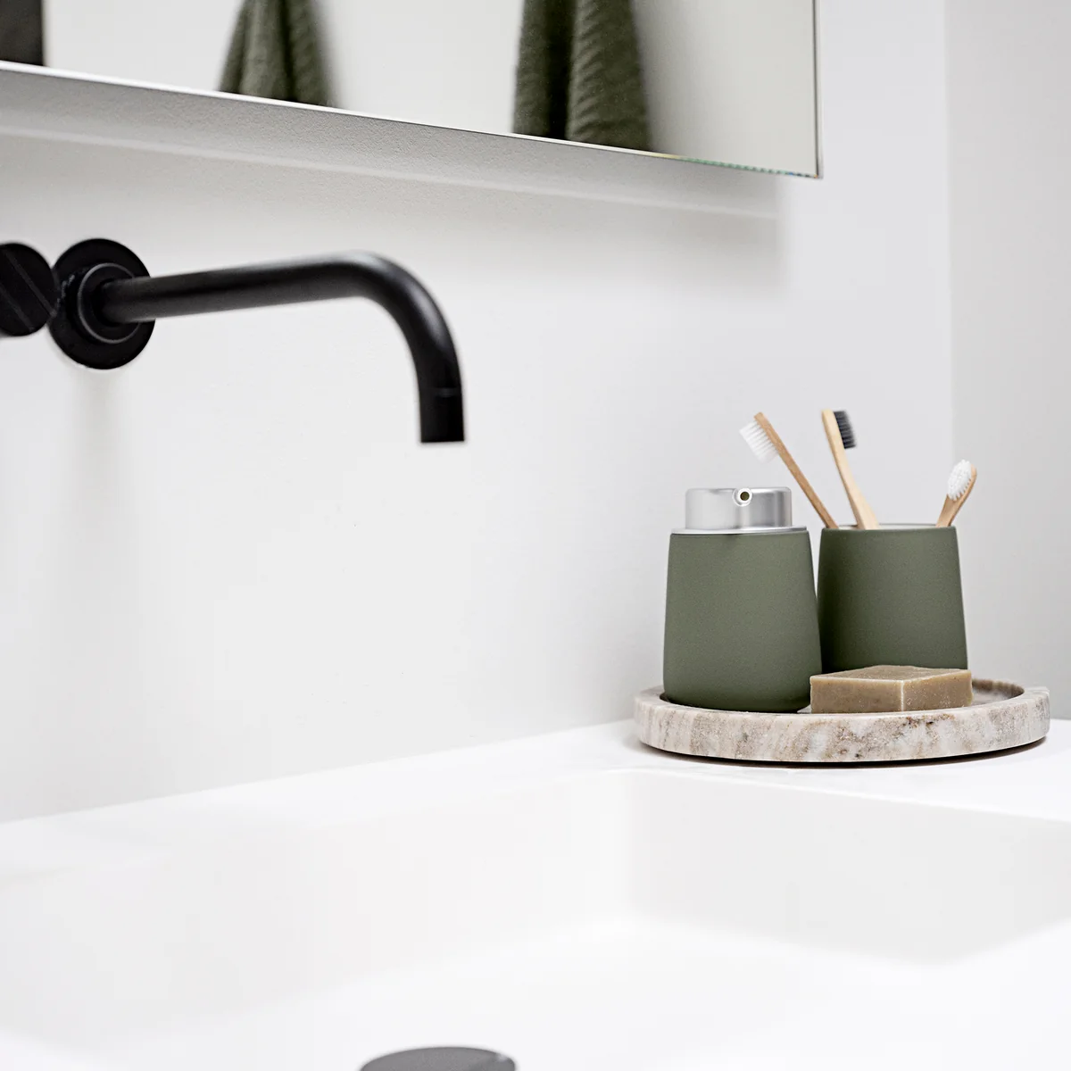 Outre le distributeur de savon, la collection comprend également des brosses à WC, des gobelets pour brosse à dents et des porte-savons en porcelaine, ainsi qu'une poubelle à pédale en ABS avec revêtement Soft Touch disponible en différents coloris. Le distributeur de savon, la brosse à WC et le gobelet pour dentifrice sont en outre disponibles dans la série Nova One sont également disponibles en grès.