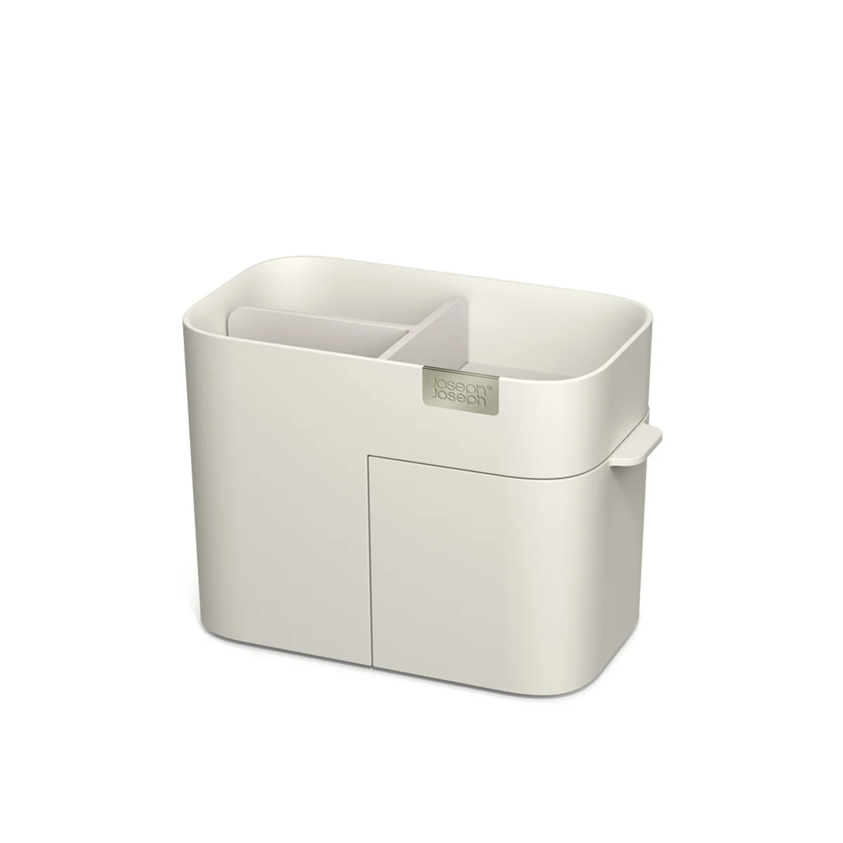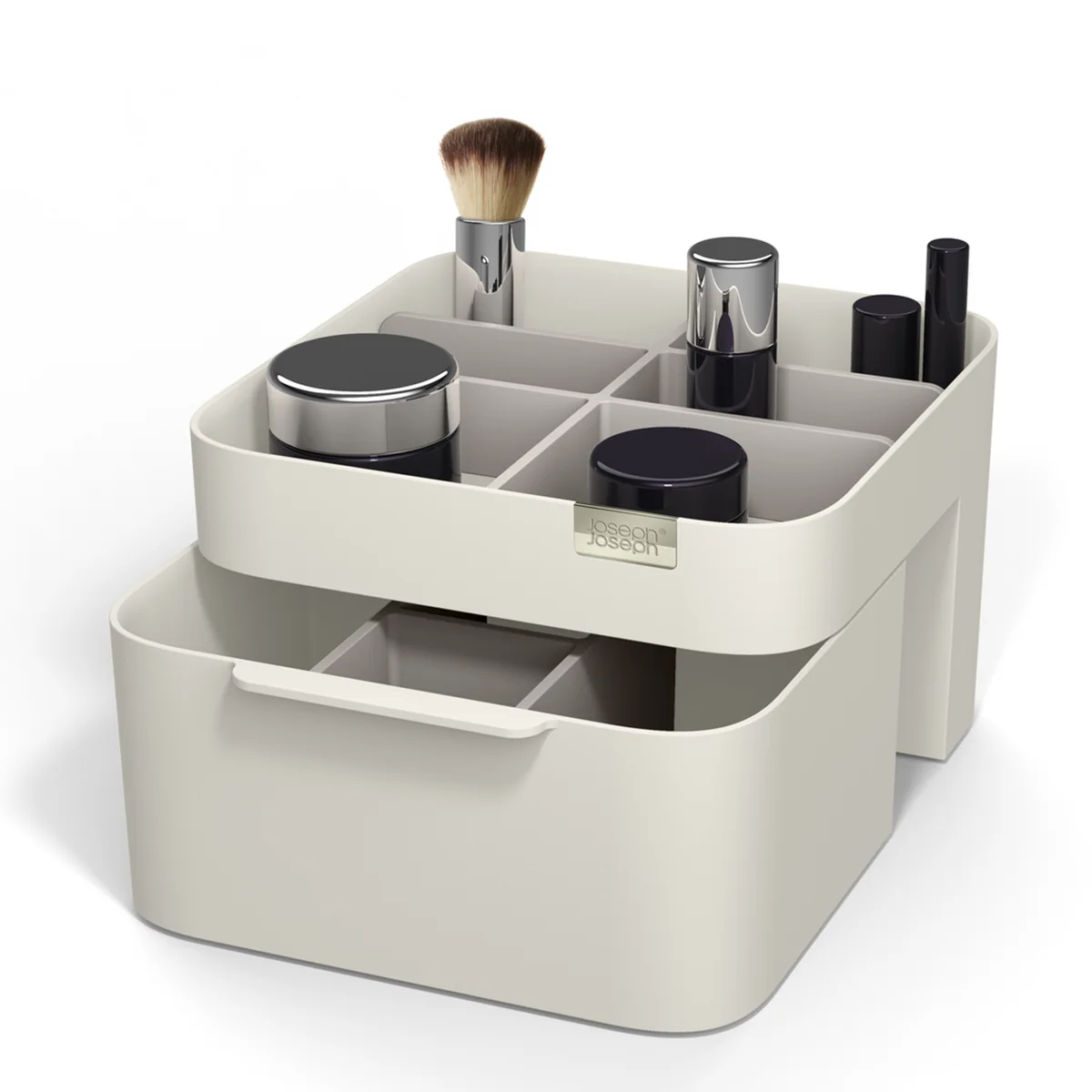 L'organisateur de cosmétiques avec tiroir Viva de Joseph Joseph permet de ranger tous les produits cosmétiques en un seul endroit. Des compartiments profonds et peu profonds offrent de l'espace pour divers produits tels que les pinceaux de maquillage, les mascaras, les rouges à lèvres et les ombres à paupières. Un tiroir à fermeture magnétique permet de ranger les cotons ou les éponges à maquillage.