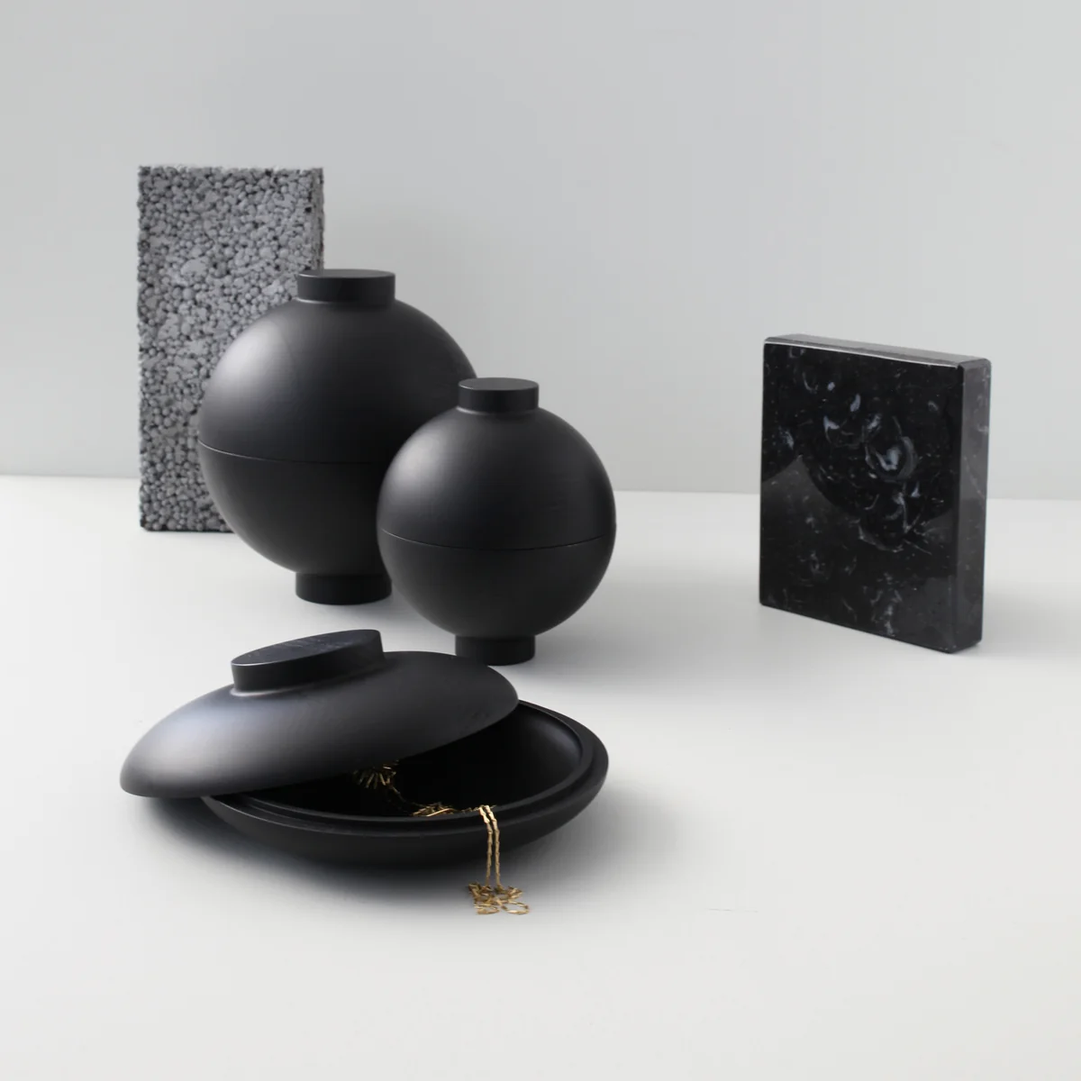 Le stockage Wooden Sphere de Kristina Dam Studio est une décoration pratique pour vraiment toute ambiance : Deux bols organiquement courbés, tournés dans du bois massif, se combinent pour former une sphère parfaite. Les bols et la sphère peuvent être utilisés à des fins diverses : Comme bol pour le maquillage et les bijoux dans la chambre à coucher, pour les accessoires dans la salle de bains, dans le salon comme décoration, sur la table à manger pour servir les en-cas, dans la cuisine pour ranger les épices et plus encore - les possibilités sont presque infinies !