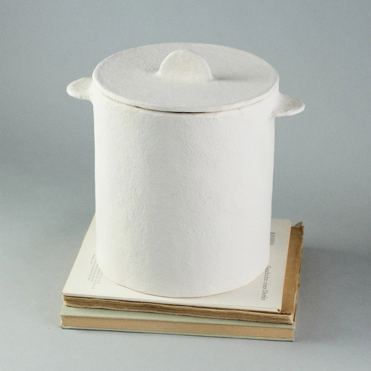 Le récipient Earth avec couvercle séduit par sa forme organique et sculpturale en papier mâché et devient ainsi un élément décoratif phare dans les espaces calmes et minimalistes. Avec sa couleur blanc cassé typique, il a un aspect à la fois moderne et artisanal. Grâce aux crochets pratiques à l'intérieur, on peut facilement y accrocher un sac poubelle - le récipient devient ainsi une corbeille à papier fonctionnelle ou un élément de rangement stylé.