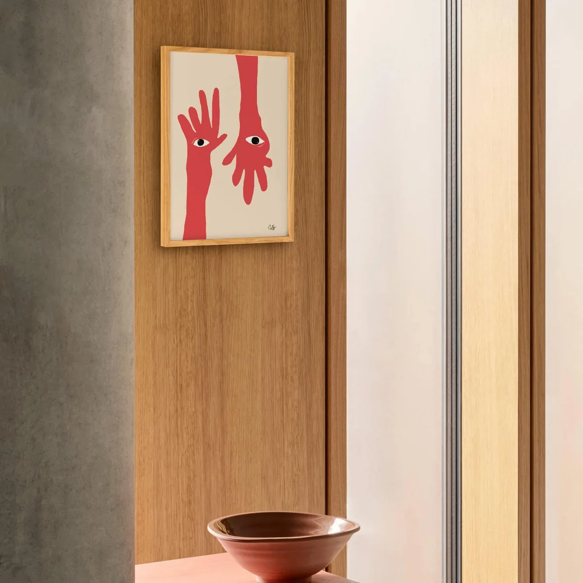 Le Hamsa Hands Affiche de Paper Collective jeux avec l'abstrait et le spirituel, avec deux mains rouges qui se balancent en haut et en bas de l'image. Au milieu, deux yeux se rencontrent, qui sont reliés pour créer un visage à partir de deux mondes séparés.