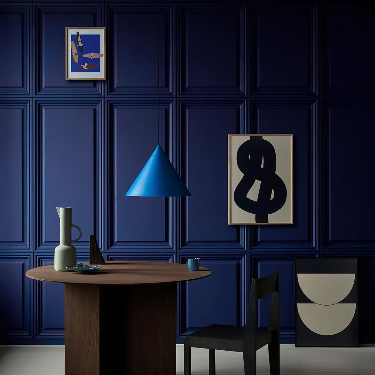 L'affiche The Knot de la designer danoise Nina Bruun montre une large ligne de nœuds, fluide, sous la forme d'une impression graphique. Le jeu d'ombres tente de donner une impression de profondeur, ce qui donne au motif un aspect particulièrement vivant. Le bleu profond de la ligne nouée crée également un contraste fort et dramatique avec le fond beige.