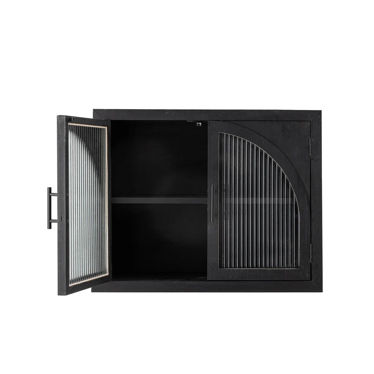 Le cabinet Lario allie fonctionnalité et design élégant. Fabriqué en pin, il séduit par sa surface noire au look légèrement usé, qui confère à l'armoire profondeur et caractère. Les portes en verre rainuré et au design délicatement incurvé apportent une touche visuelle unique. Idéal pour ranger et présenter avec style vos objets préférés - un meuble élégant pour le salon et la salle à manger.