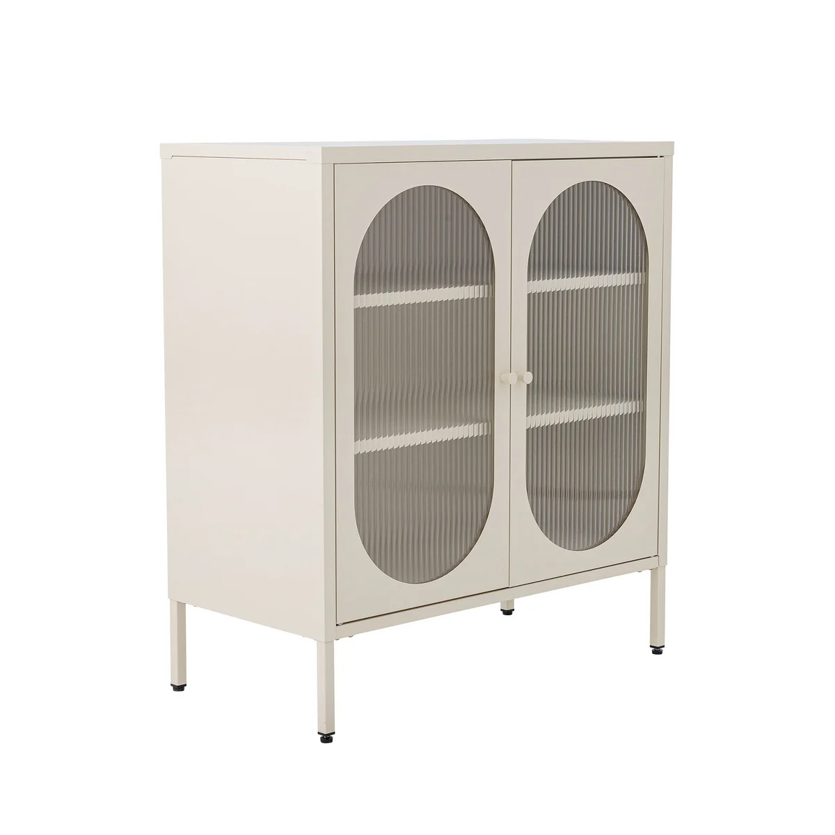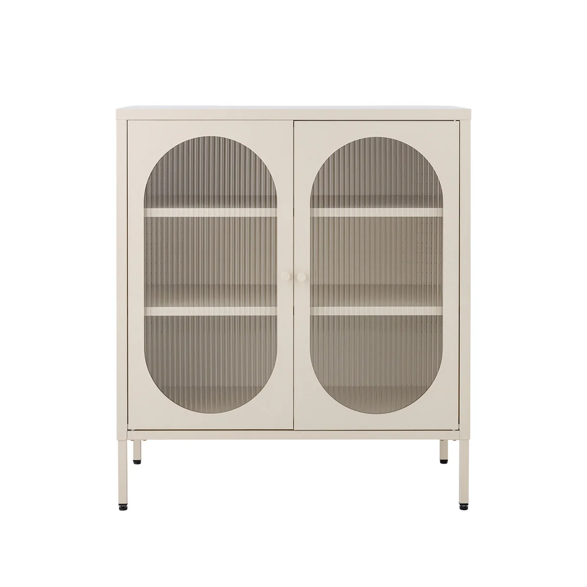 Le cabinet Salvo séduit par son design élégant dans un doux ton sable. Fabriqué en métal, il combine fonctionnalité et détails esthétiques. Les deux portes sont dotées d'un verre décoratif strié qui confère à l'armoire une légèreté stylée. Avec ses étagères pratiques, l'armoire est idéale pour le rangement et la présentation - parfaite pour le salon, la salle à manger ou l'entrée.