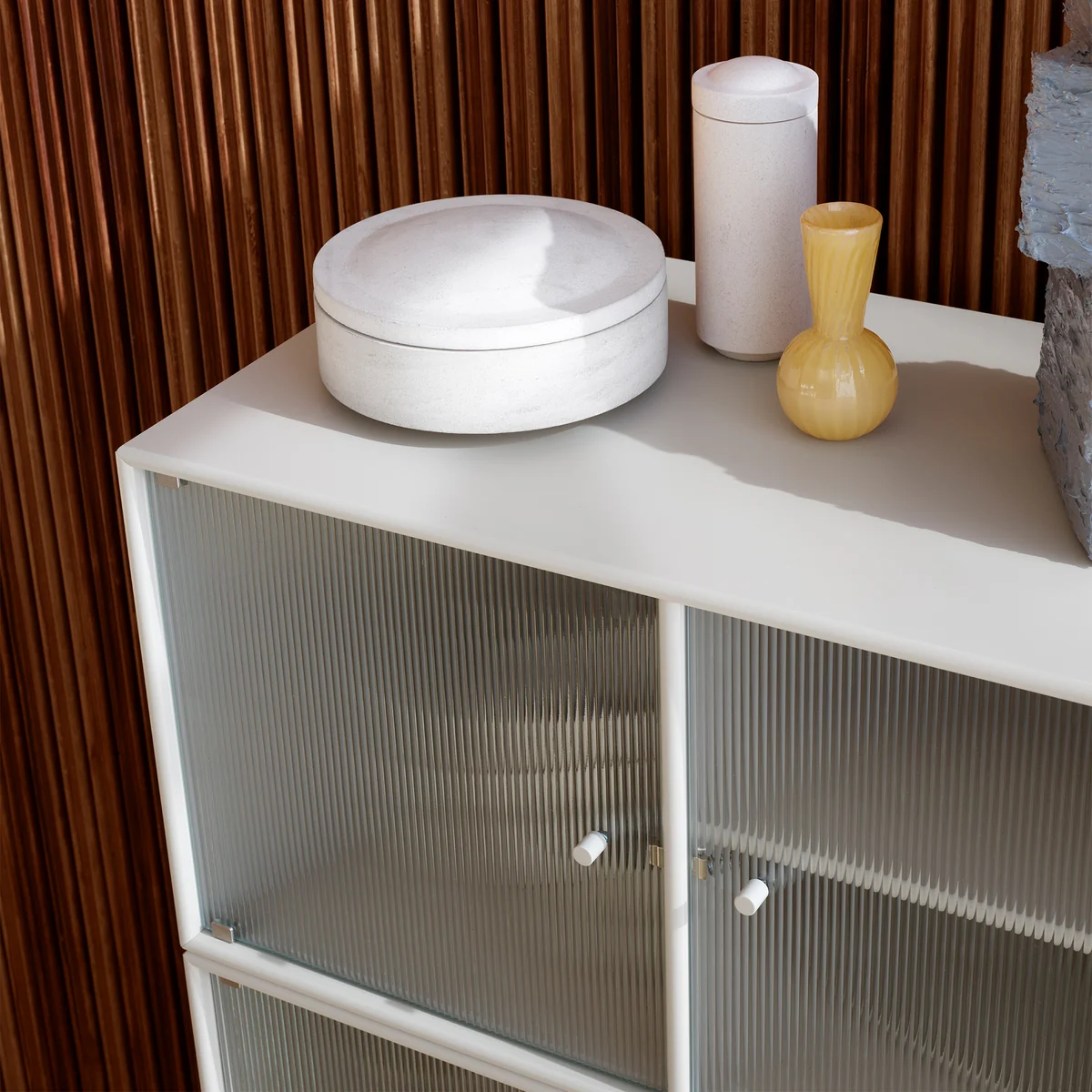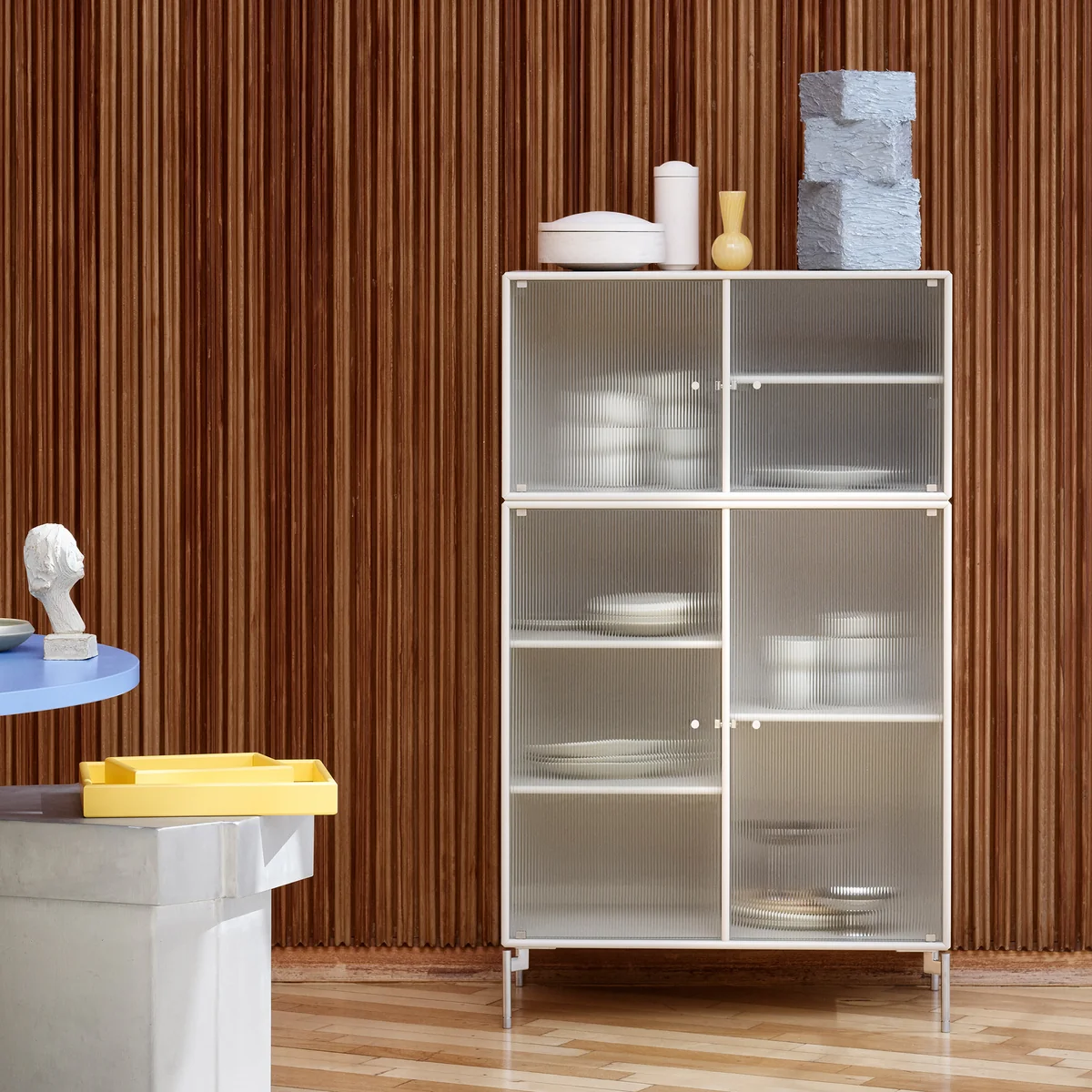 L'armoire vitrine Ripple III de Montana se présente comme une vitrine de taille moyenne avec quatre portes, chacune munie d'un verre cannelé. Cette armoire est disponible en différentes versions, soit avec des pieds, soit avec un socle ou des ferrures de suspension pour le montage mural.