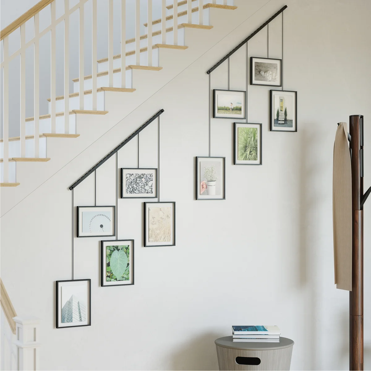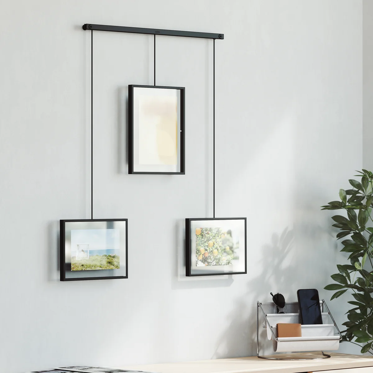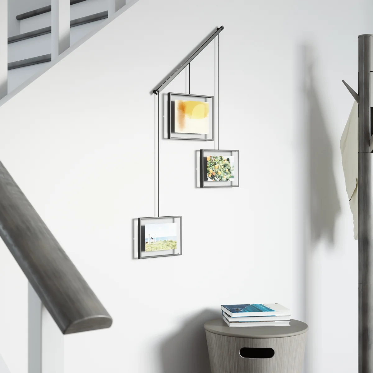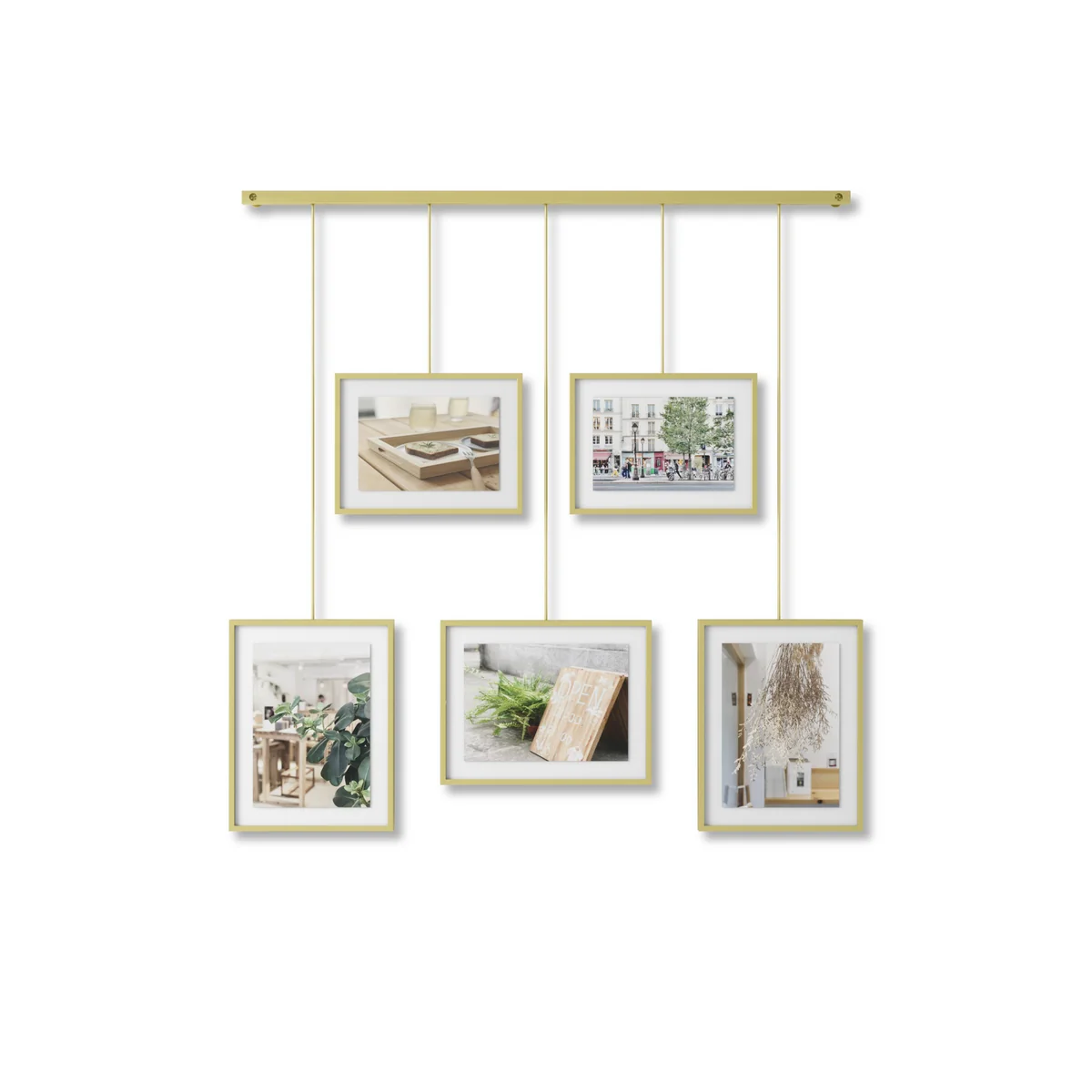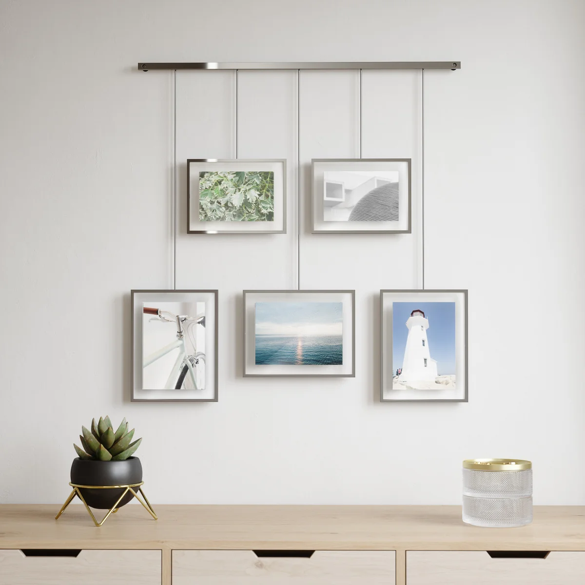 Le Exhibit Le cadre photo de Umbra s'adapte aux préférences de mise en page les plus diverses. Les cadres peuvent être déplacés le long de la barre métallique et tournés en orientation paysage ou portrait. Toutes sortes de photos, d'œuvres d'art et d'illustrations favorites peuvent être placées dans les cinq cadres de différentes tailles. Les cadres design servent également de décoration murale magnifique et accrocheuse pour le salon ou le couloir.