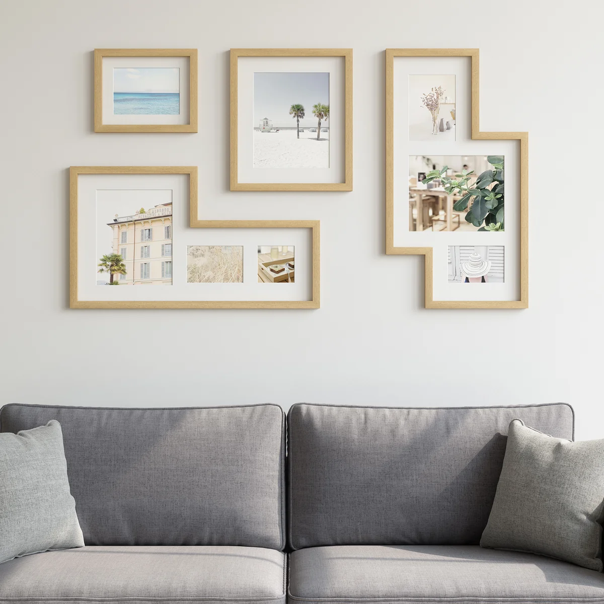 Les cadres de forme inhabituelle offrent de la place pour une photo de 10x10 cm, 10x15 cm, 13x18 cm et 20x21 cm. Il n'y a donc aucune limite à votre imagination pour créer un tout nouveau type de galerie dans le salon, la chambre ou le couloir.