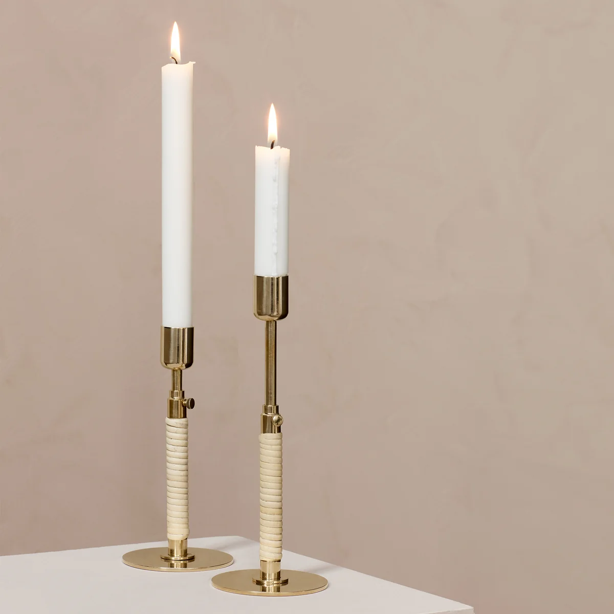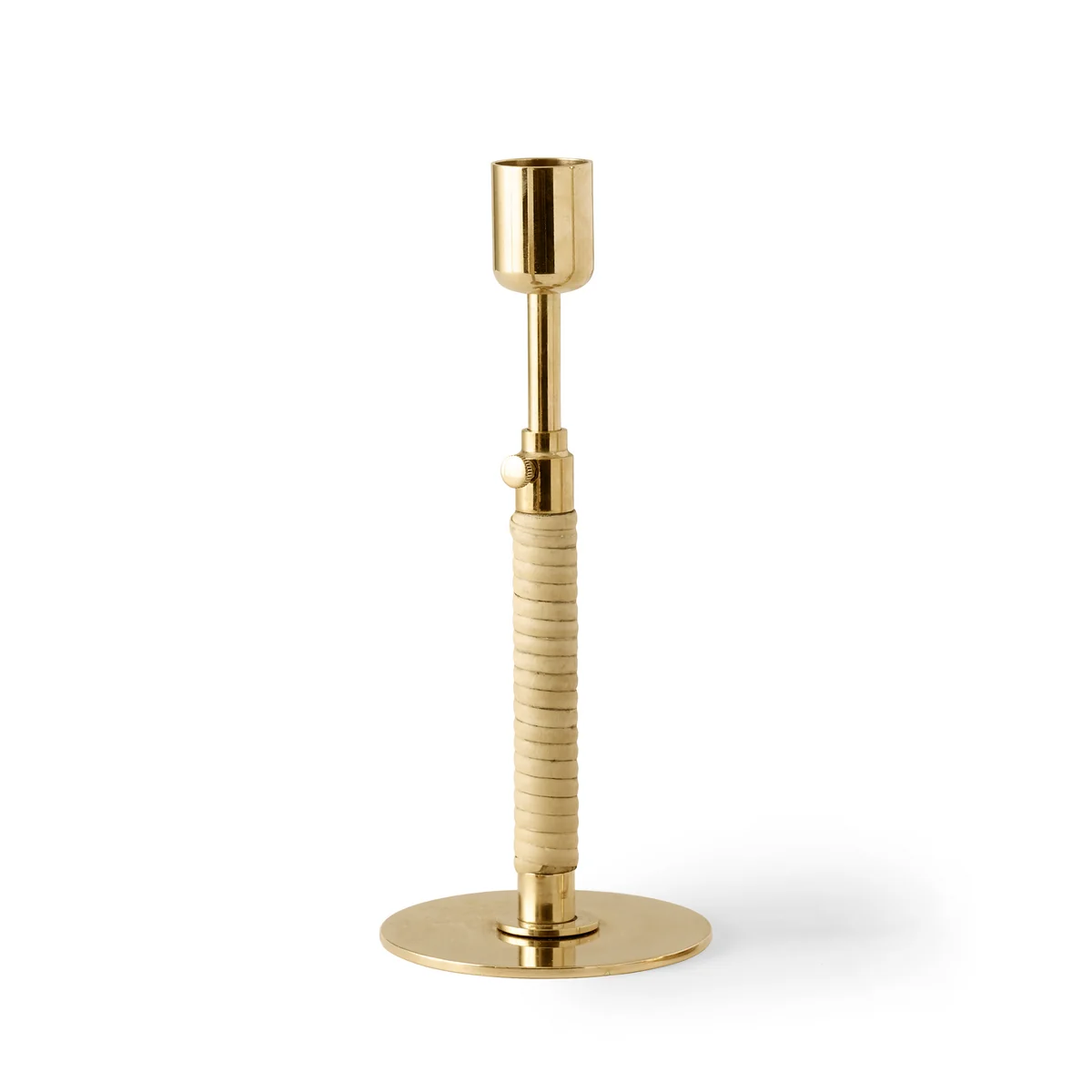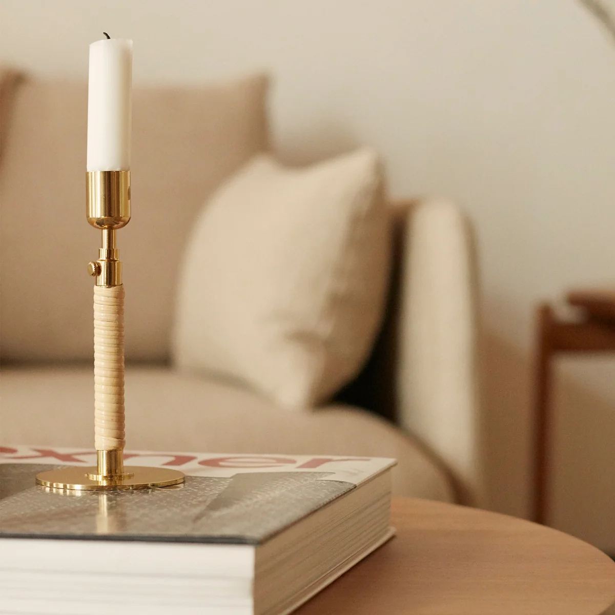 Le bougeoir Duca du studio de design danois Krøyer-Sætter-Lassen pour Audo se distingue par la combinaison de différents matériaux ainsi que par sa fonction particulière : En desserrant la vis sur la fine tige, la hauteur du bougeoir peut être ajustée pendant la combustion de la bougie. Fabriqué en laiton poli ou bruni et détaillé avec du rotin enroulé autour de la moitié inférieure, ce design simple mais efficace confère intimité et chaleur à son environnement.