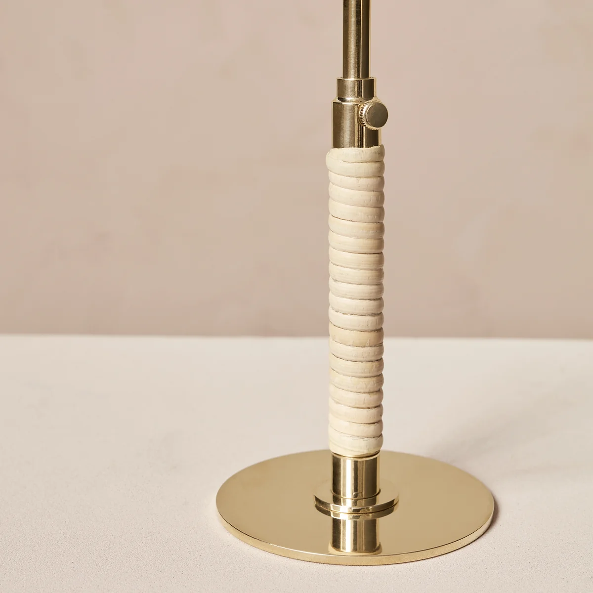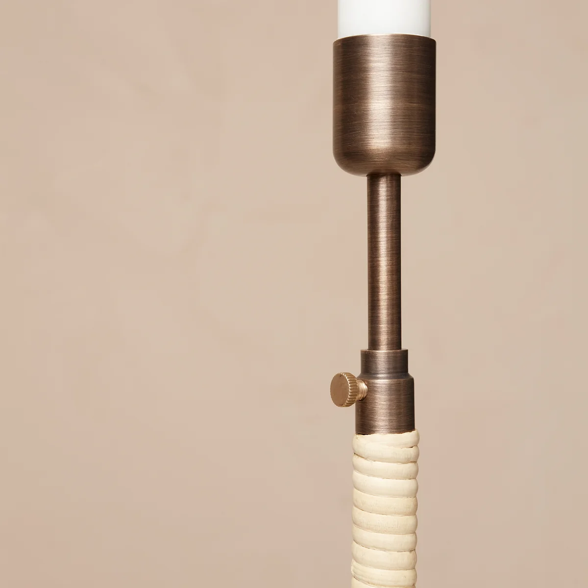 La fonction de vissage remet en question la silhouette typiquement statique de l'objet et permet à l'utilisateur de personnaliser la hauteur du bougeoir en l'allongeant ou en le raccourcissant. Duca est disponible en laiton poli ou en laiton bronzé associé au rotin et combine des matériaux naturels pour créer un look cosy dans l'ambiance.