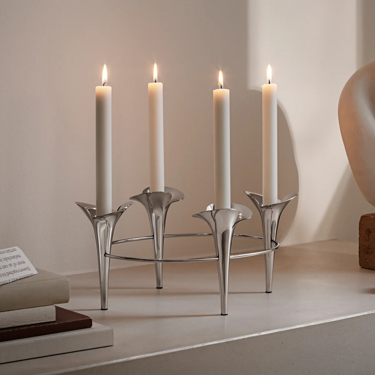Le Bloom Botanica bougeoir de la maison danoise Georg Jensen s'inspire de la période de floraison du printemps. Le bougeoir, composé de quatre fleurs qui s'épanouissent, est fabriqué en acier inoxydable et est disponible en différentes versions. Il existe par exemple en version classique ou dorée.
