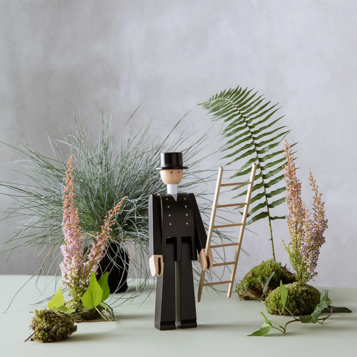 Cela porte chance de les voir. En effet, il n'est pas rare qu'ils disparaissent pendant de longues heures dans la cheminée et qu'ils en ressortent sous forme de personnages noirs comme la poix. Les ramoneurs font également partie du répertoire des légendaires figurines en bois de l'icône du design danois Kay Bojesen. Avec un chapeau haut de forme élégant et distingué et une échelle détaillée à la main, le gentil ramoneur donne une impression ludique et se combine parfaitement avec d'autres figurines de Kay Bojesen.