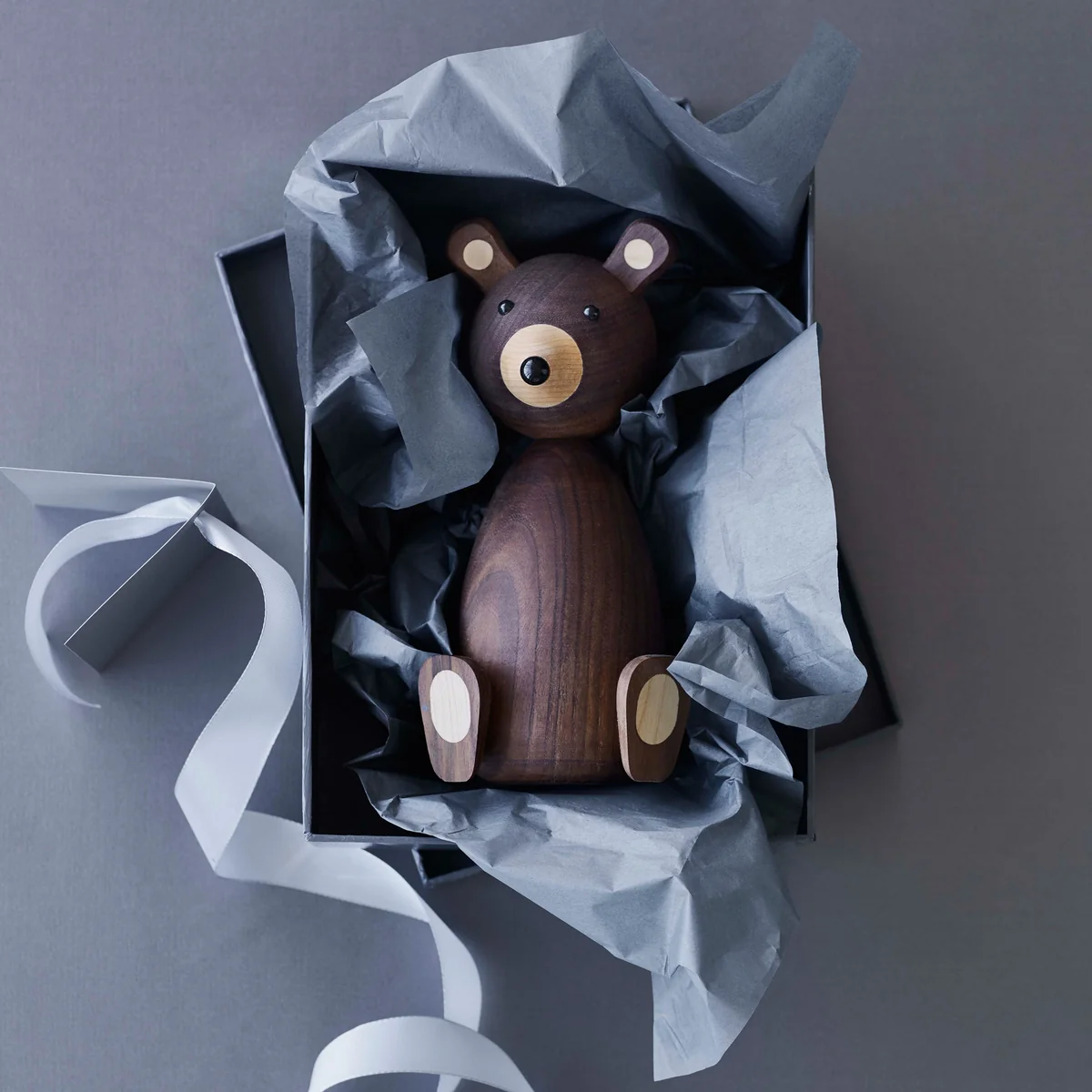 Les figures d'ours sont faites de noyer américain avec des détails clairs sur les oreilles, le nez et les pieds. Grâce à leur forme classique et aux matériaux de haute qualité, les ours sont de véritables objets de design qui peuvent accompagner leurs propriétaires toute leur vie.