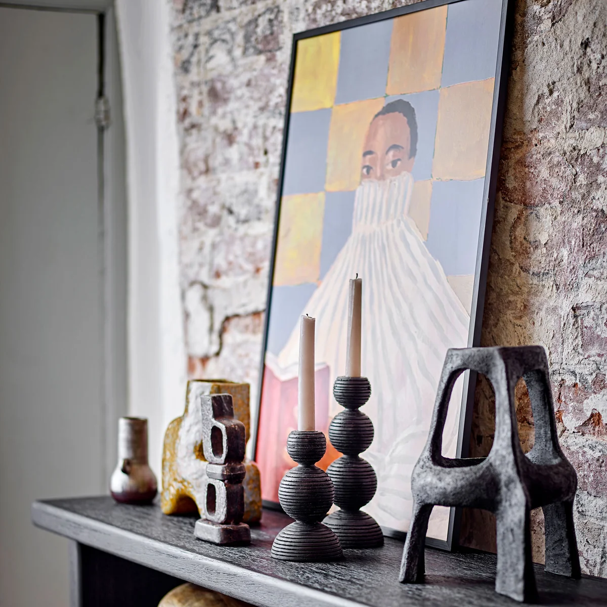 L'illustration Filicia avec cadre associe des tons chauds de bleu, de jaune, de rouge et de brun pour créer une œuvre d'art pleine d'ambiance. Le motif créatif est encadré avec style par l'élégant cadre en pin noir et s'intègre harmonieusement dans différents styles d'aménagement.