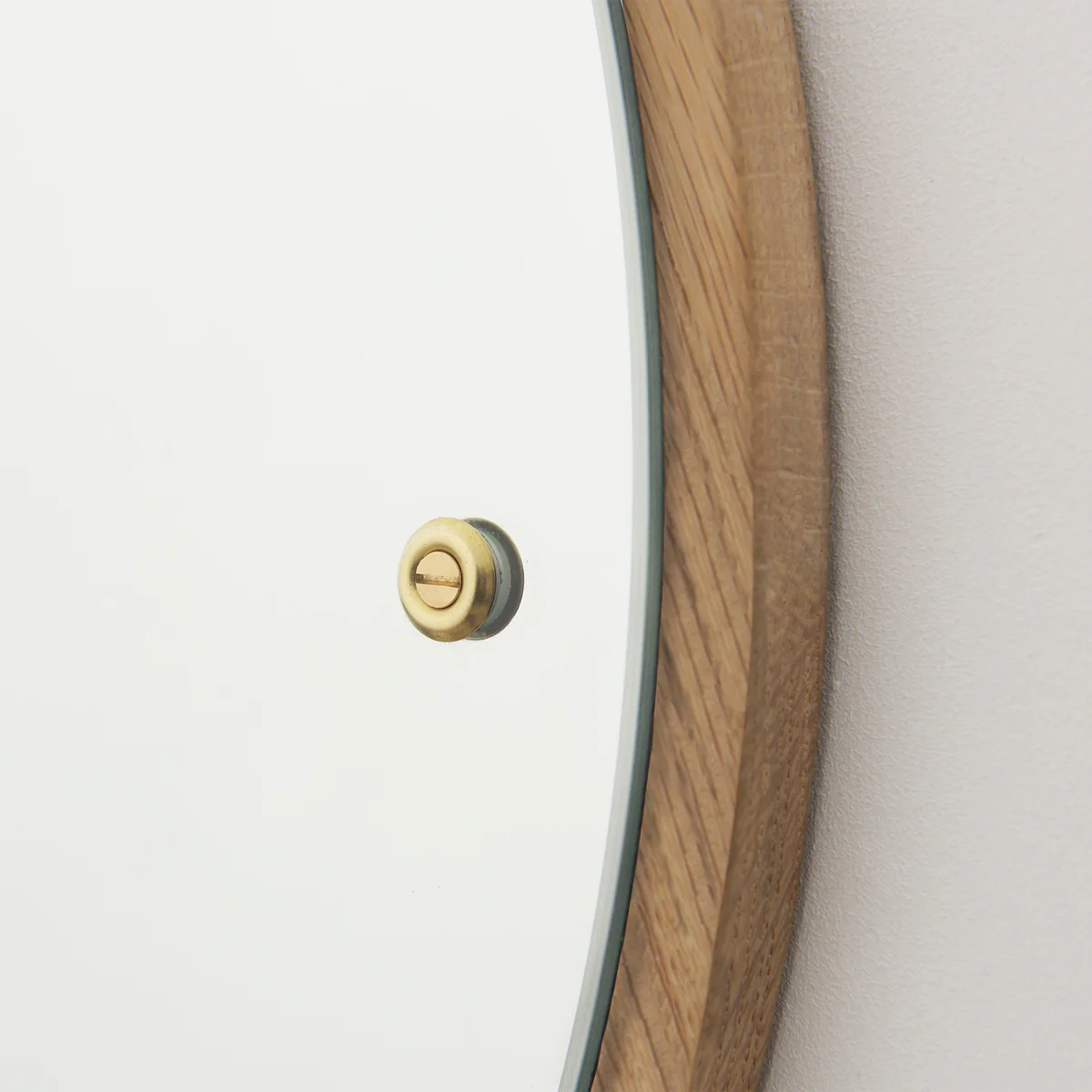 Le miroir rond est monté au mur sur une plaque en chêne massif et maintenu en place par des vis visibles qui rendent un hommage créatif aux années 1950.