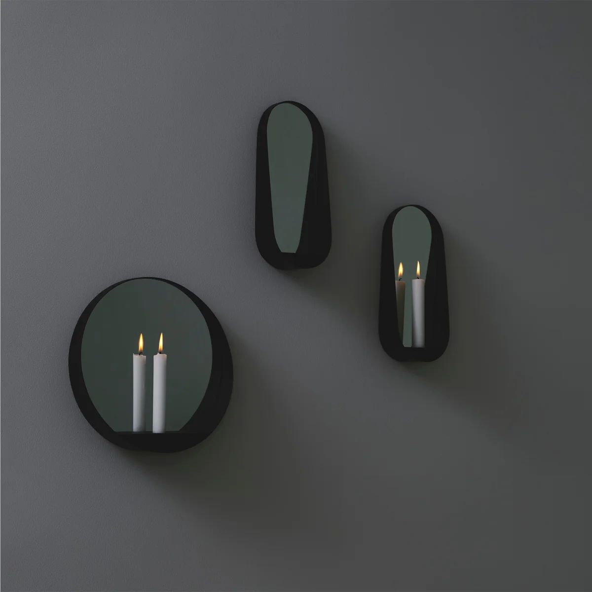 Glim est un miroir avec un bougeoir suspendu au mur, Gejst conçu par Böttcher & Kayser. Le miroir intensifie la lumière du bougeoir, s'inspire de vieilles lanternes et crée sur chaque mur une atmosphère "Hygge" danoise et chaleureuse.