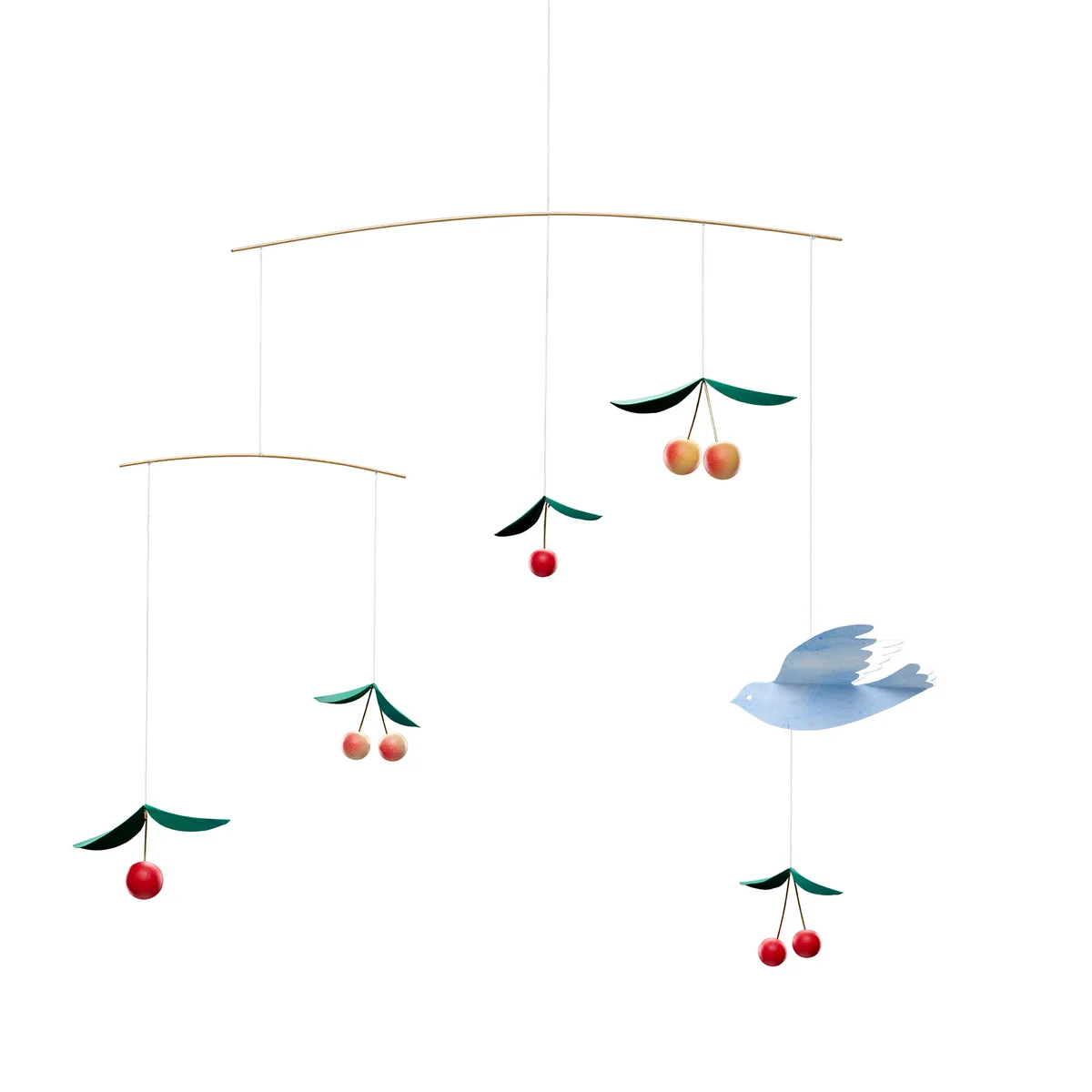 Le charmant Cherry Dreams mobile est fabriqué en laiton, carton et bois dans des couleurs fraîches.