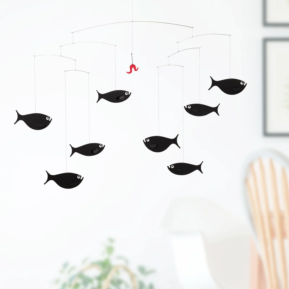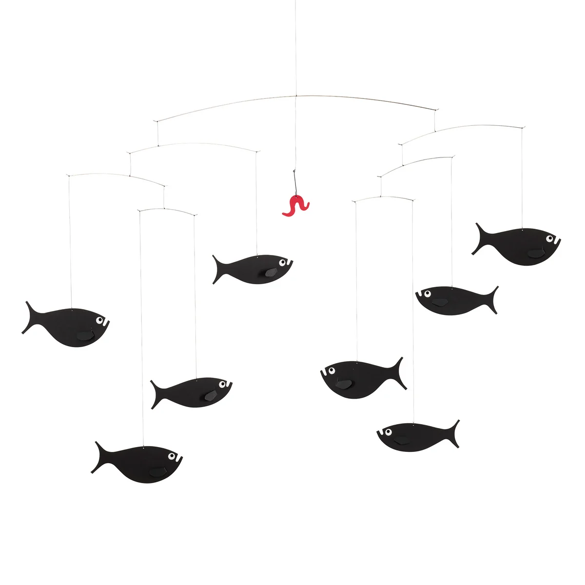 Le mobile Shoal of Fish de Flensted Mobiles est un mobile conçu avec amour et au look ludique. Huit poissons se déplacent calmement et puissamment - quand remarqueront-ils le délicieux ver qui semble si tentant sur l'étrange hameçon ?