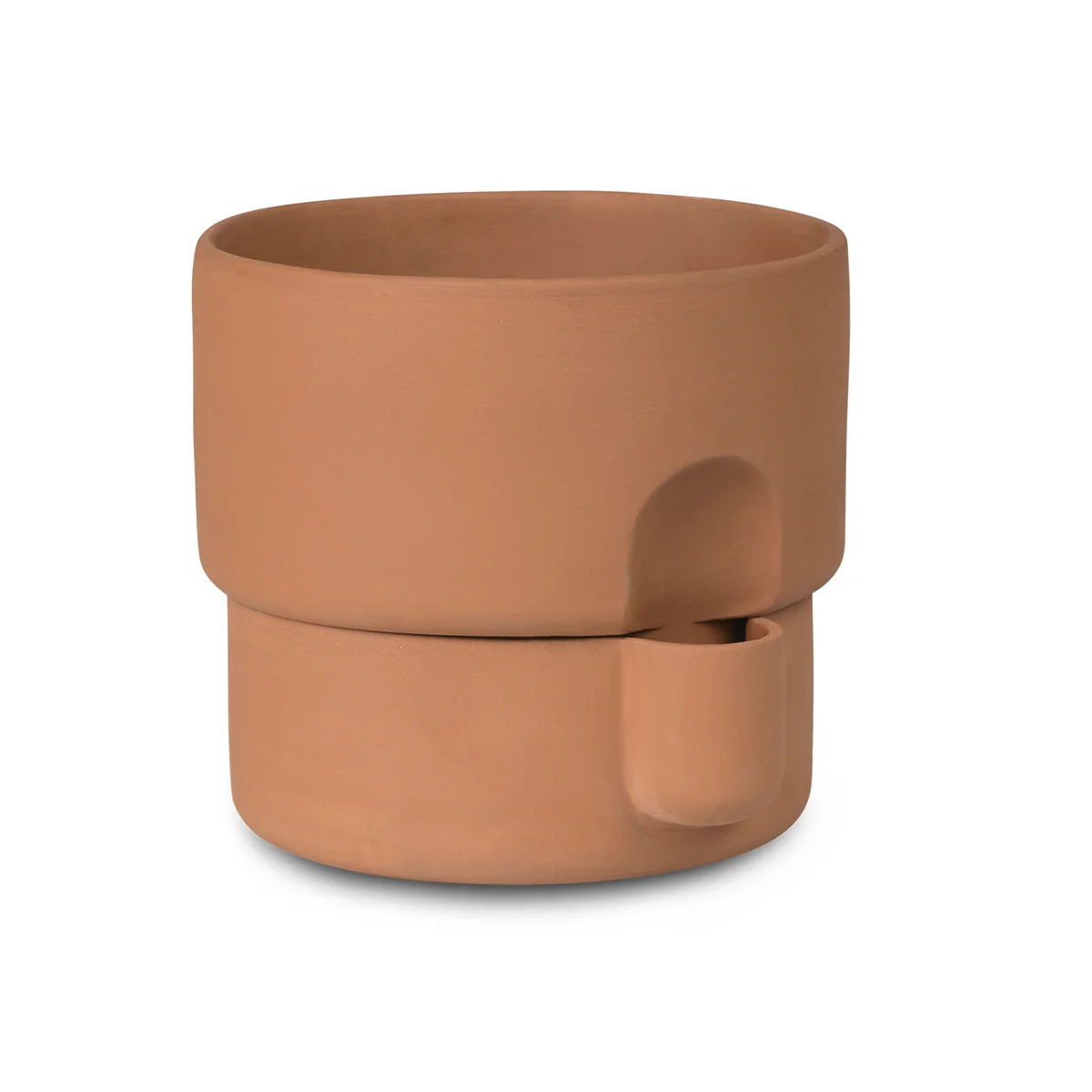 Oasis se compose de deux pots qui sont simplement insérés l'un dans l'autre. Le pot intérieur en terre cuite contient la plante correspondante, tandis que la jardinière en terre cuite émaillée sert de réservoir d'eau. Un petit dispositif d'arrosage permet de verser facilement l'eau dans le pot, que la plante aspire ensuite par le fond du pot intérieur.
