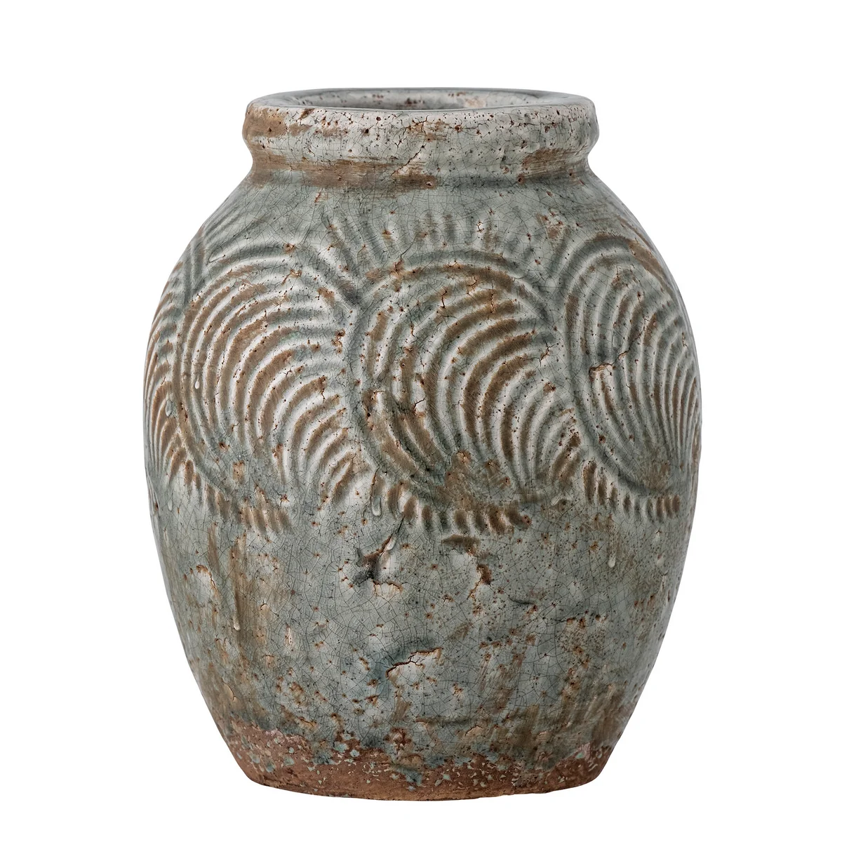 Le vase décoratif Damian de Bloomingville est un vase rustique en terre cuite. Le vase a une belle glaçure réactive verte et un motif abstrait gravé. En raison de la nature de l'émail ainsi que de la technique artisanale, il peut y avoir des variations de couleur - Parfait pour les fleurs séchées, car il n'est pas étanche à 100 %.