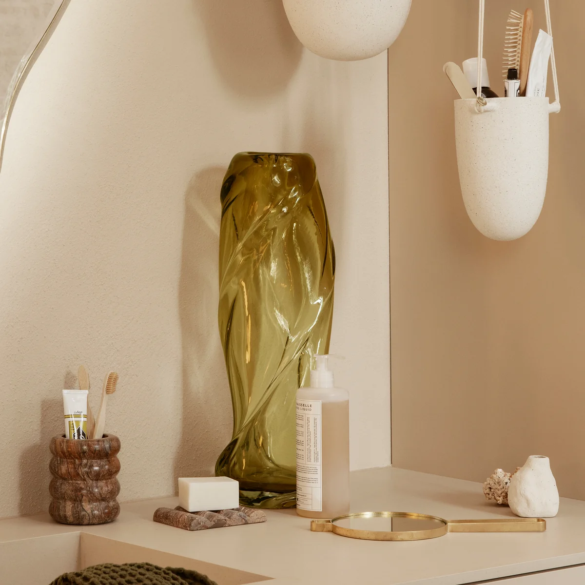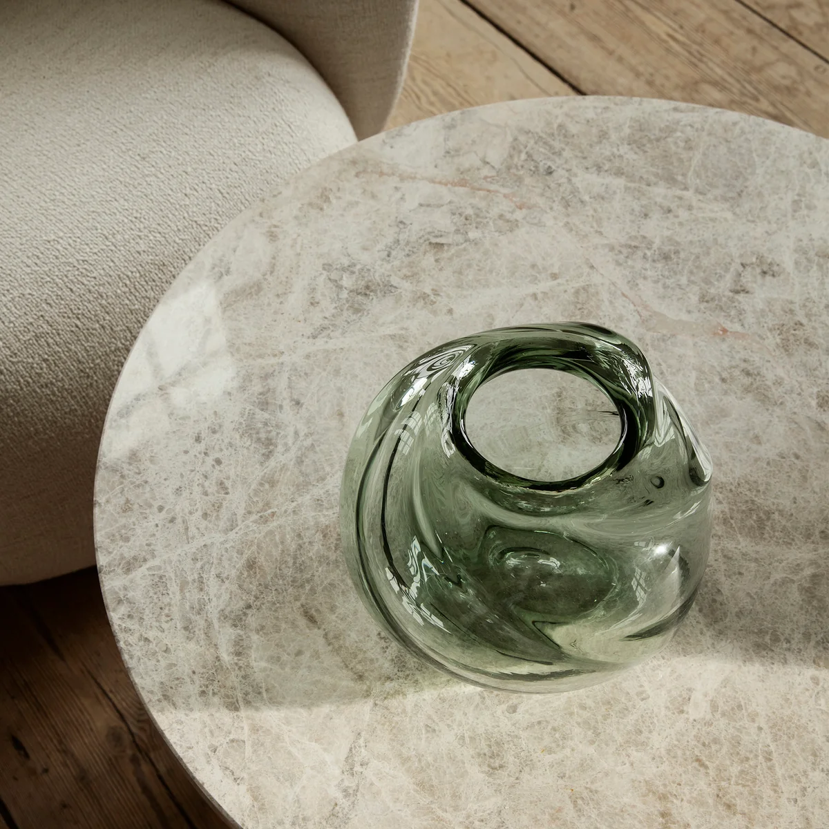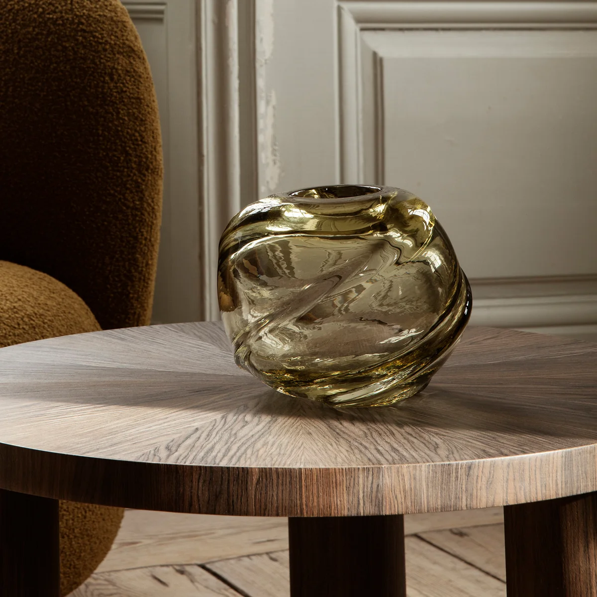 Le vase soufflé à la bouche Water Swirl de Ferm Living rappelle le tourbillon de l'eau qui tombe. Grâce à son verre coloré translucide, le vase crée une expression gracieuse et naturelle, presque dansante, bien qu'il soit fait de verre massif et solide.
