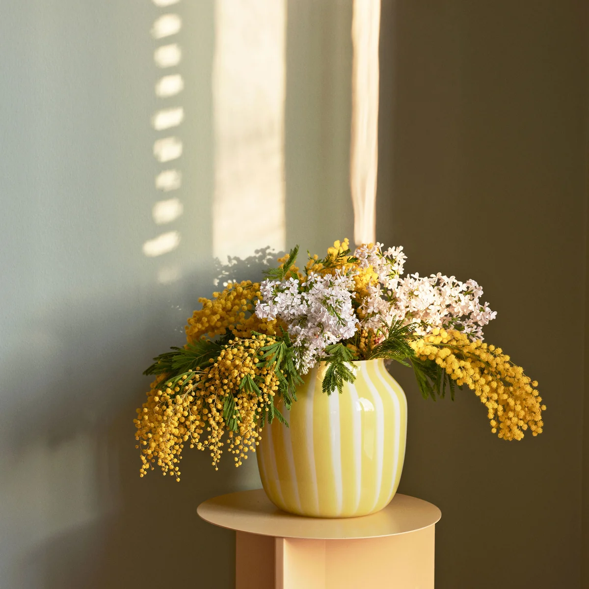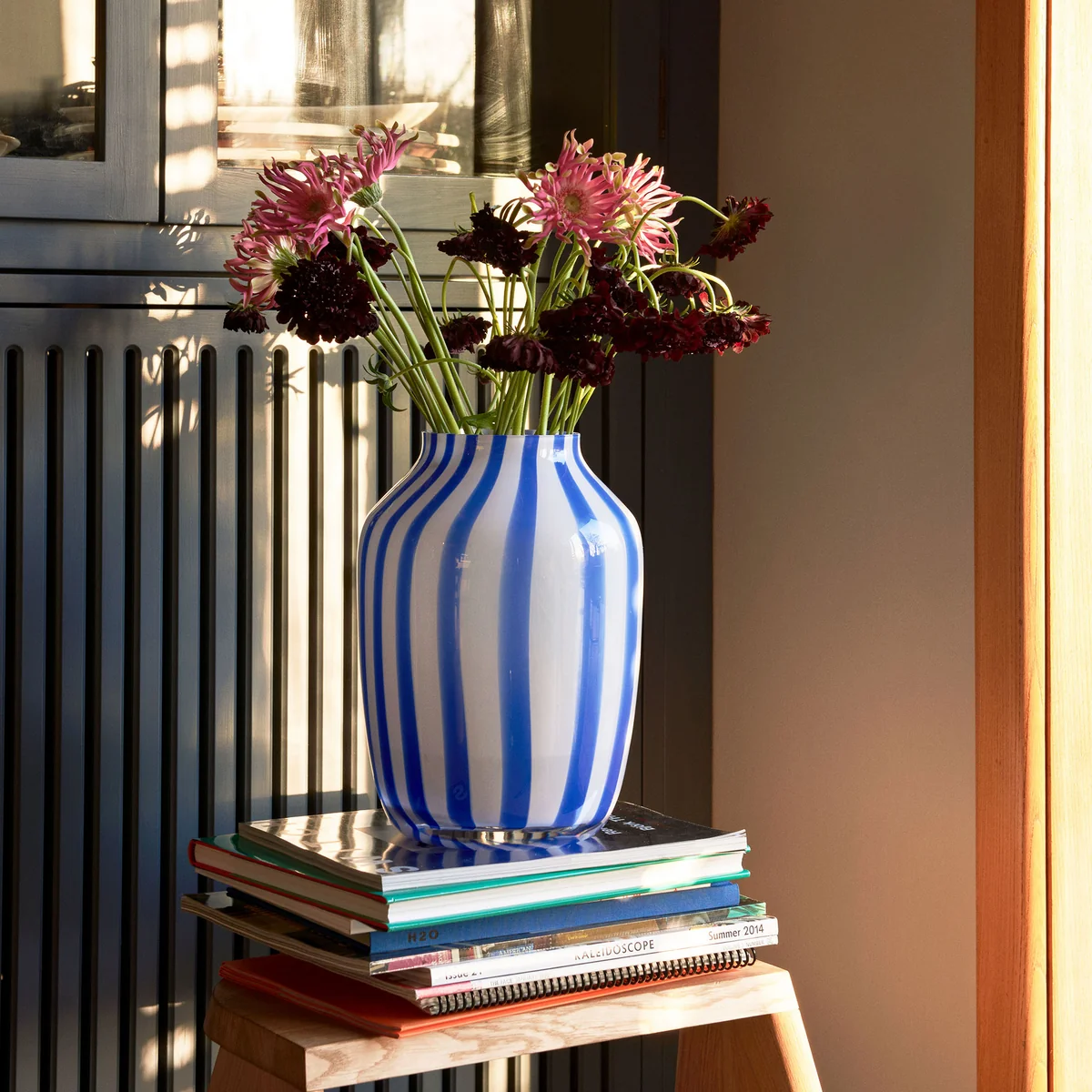 Le vase à jus de HAY, avec ses couleurs fraîches et son motif à rayures, attire le regard. Avec ou sans fleurs, les vases se font décoratifs sur la table à manger, la table d'appoint ou sur le rebord de la fenêtre dans n'importe quelle pièce. Les rayures verticales, opaques et transparentes créent une subtile variance de couleurs dans la série de vases en verre Kristine Five Melvær.