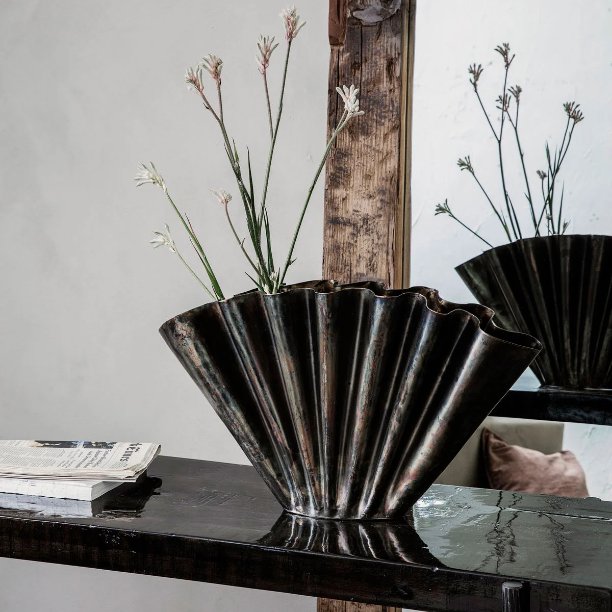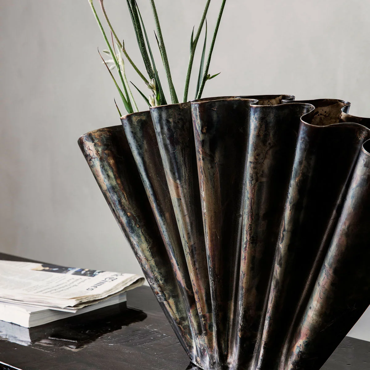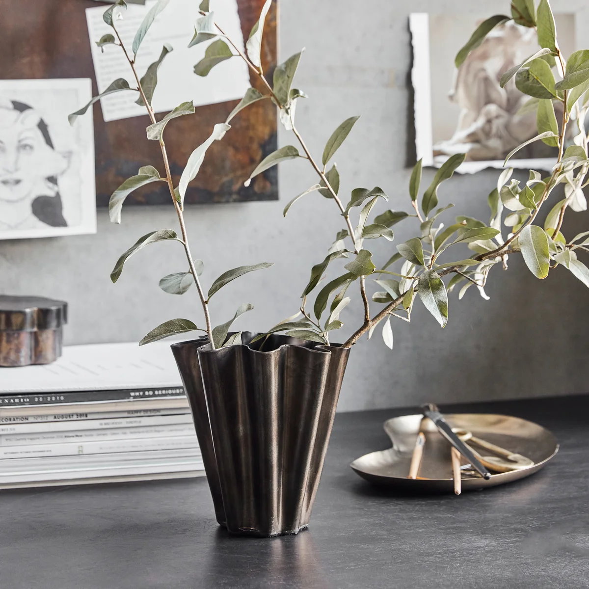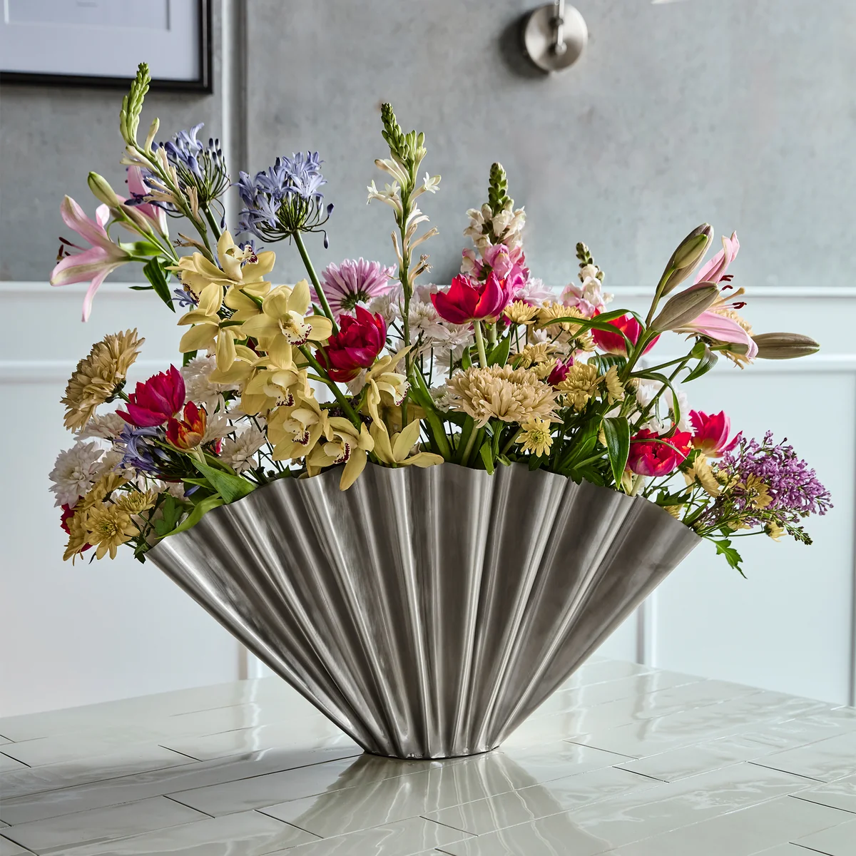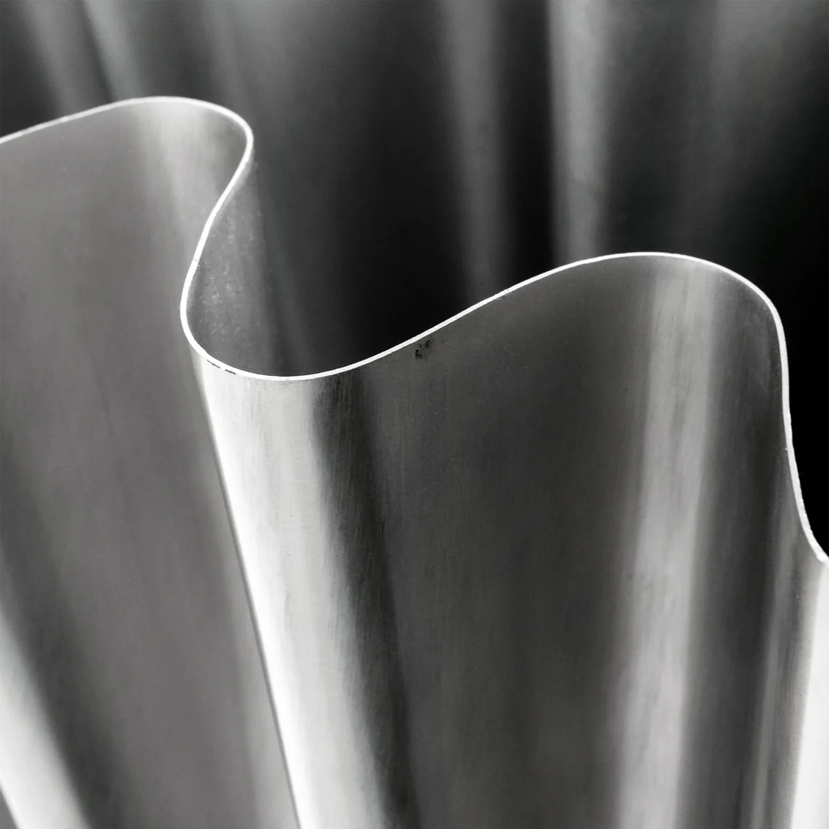 Les plis dynamiques du vase ne sont pas seulement décoratifs, ils soutiennent les brins des fleurs. Le vase peut ainsi accueillir aussi bien des fleurs et des arbustes individuels que des bouquets luxuriants.