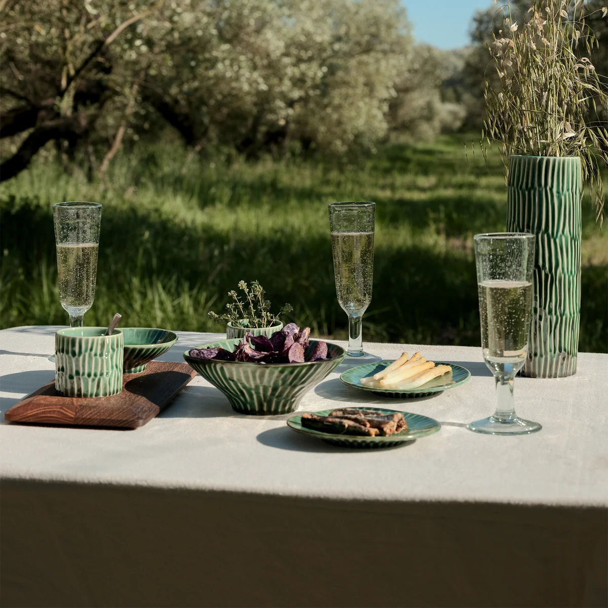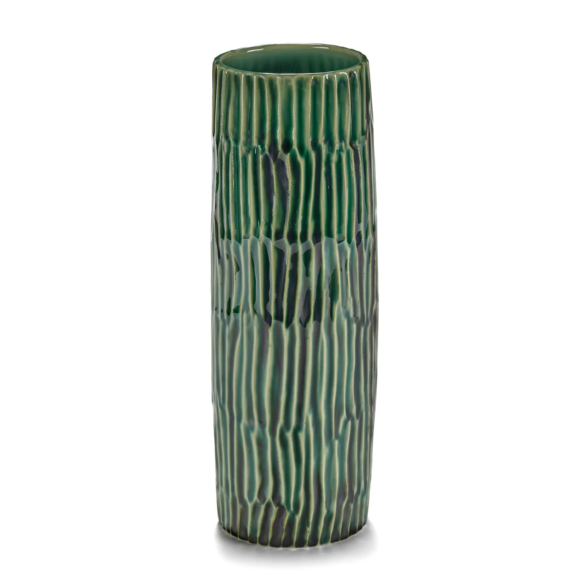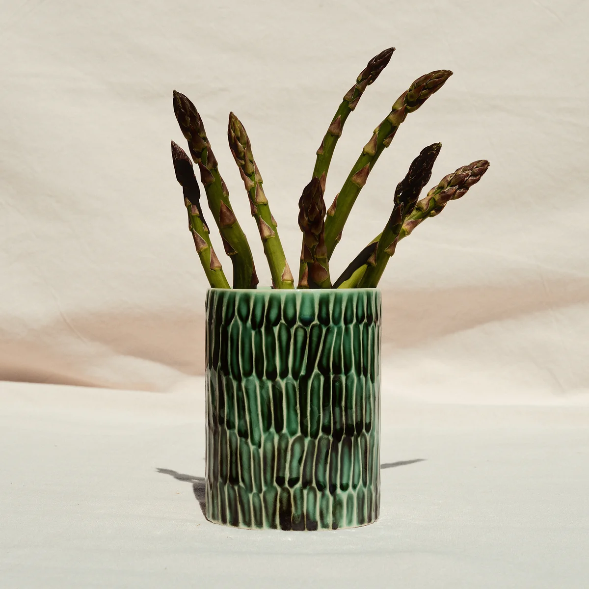 Le vase Verde Lanza de Pascale Naessens pour Serax allie fonctionnalité et design expressif. Fabriqué en faïence, il s'inspire des fenêtres et des portes vertes ainsi que de la végétation de Lanzarote, où la designer vit souvent. L'émail bronzé dans un ton vert naturel est ennobli par une texture en forme de coquillage que Naessens a elle-même imprimée avec ses doigts. Que ce soit pour les ustensiles de cuisine, les couverts ou les fleurs, le vase est un accessoire polyvalent qui enrichit la cuisine et la salle à manger avec style.
