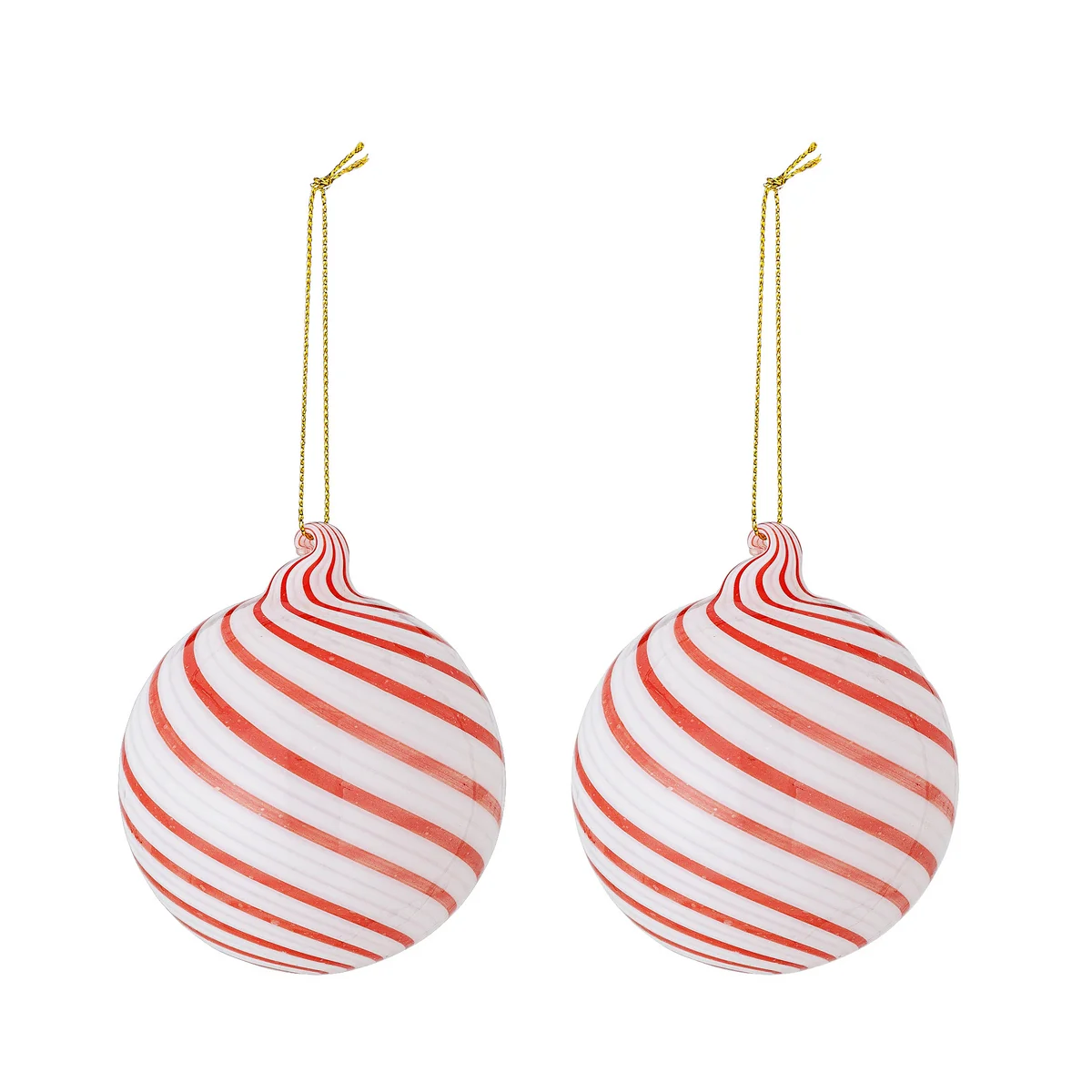 Les boules de Noël Zwirl de Bloomingville apportent une ambiance de fête nostalgique à l'arbre avec leur motif tourbillonnant rouge et blanc. Chaque ornement soufflé à la bouche est unique et rappelle les cannes à sucre classiques - complétées avec style par une suspension dorée.