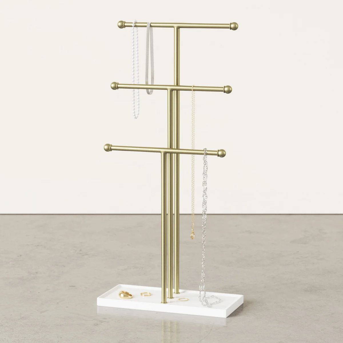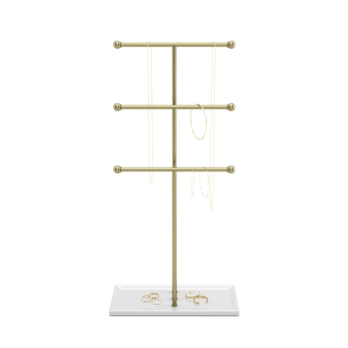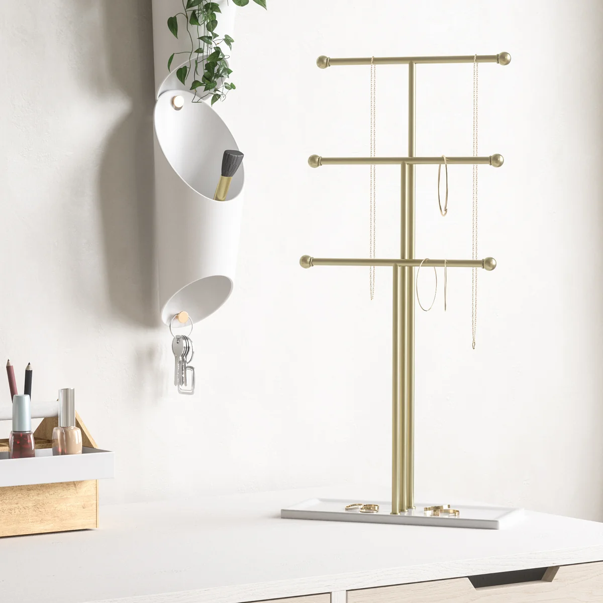 Avec le Trigem de Umbra permet de présenter ses bijoux préférés avec style. Le support à trois niveaux permet de disposer clairement les chaînes, bracelets, montres et bagues sur les différents niveaux et veille en outre à ce que les chaînes ne s'emmêlent pas.