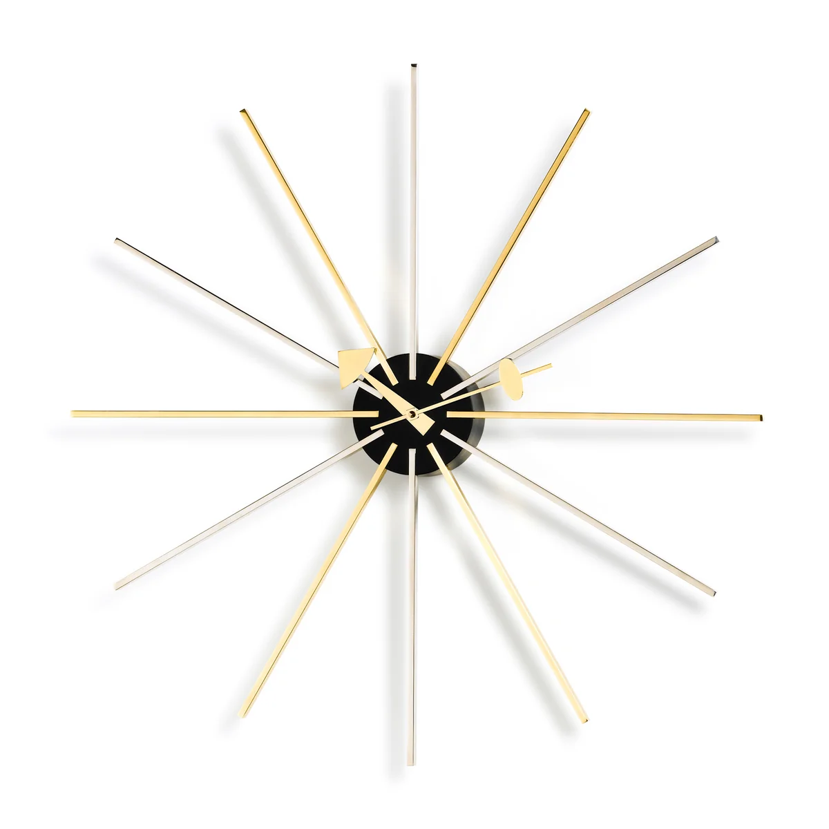 Les rayons et les aiguilles de l’horloge en forme d’étoile se composent de chrome et de laiton et alternent entre un ton d’or et d’argent.