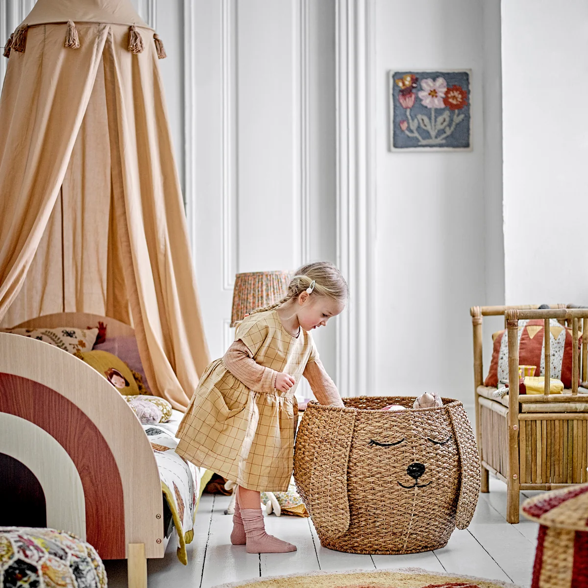 Le panier Milus de la Mini Collection de Bloomingville est une solution de rangement incroyablement mignonne. Disponibles en set de 2, les paniers peuvent parfaitement être utilisés pour ranger les jouets d'enfants et les petits coussins et couvertures. Les paniers sont décorés d'un adorable visage de chien et de chat, les oreilles du chien étant suspendues et celles du chat dressées. Ils sont fabriqués en herbe de bankuan, en rotin et en fer.