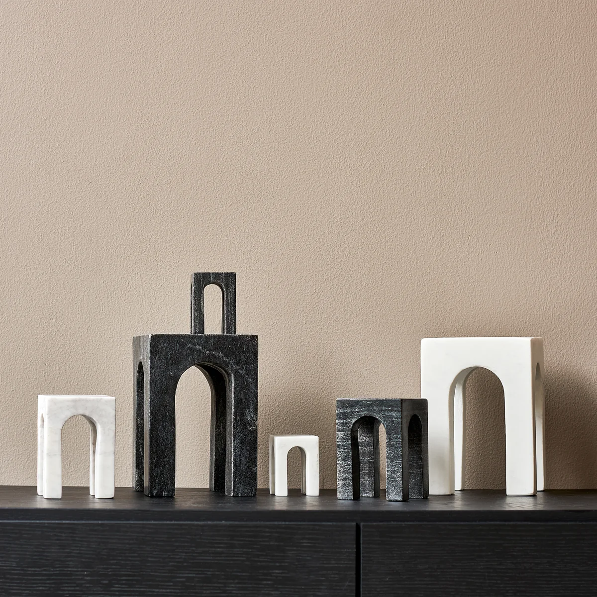 Arkis peuvent être placés de manière flexible comme un objet triple ou séparément. Le serre-livres est fabriqué en marbre et est disponible en deux couleurs différentes.