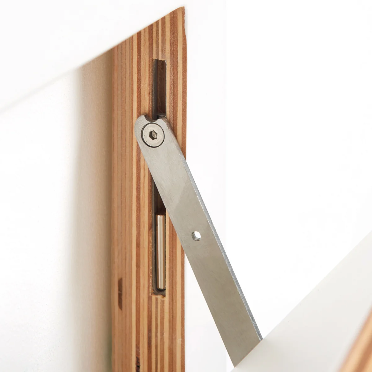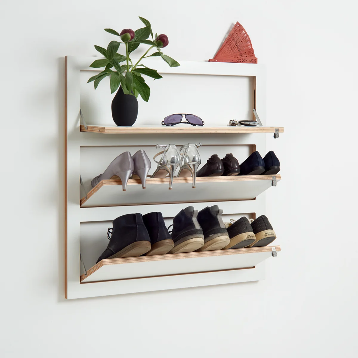 Pour mettre fin aux montagnes de chaussures sous la garde-robe, toutes les étagères peuvent être Fläpps Les étagères murales de faible profondeur peuvent être transformées en étagères à chaussures grâce à une astuce. En plaçant des tiges magnétiques dans les rails de guidage des charnières, les abattants des étagères ne s'ouvrent plus qu'à 45 degrés et permettent ainsi un rangement pratique des chaussures et autres objets pouvant être stockés en biais.