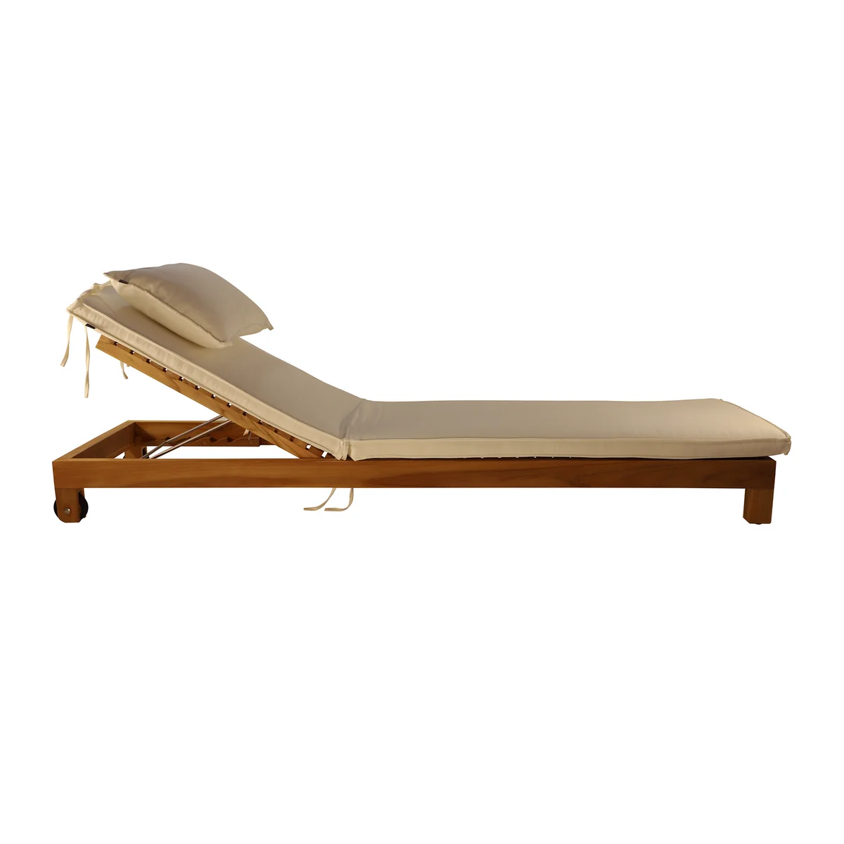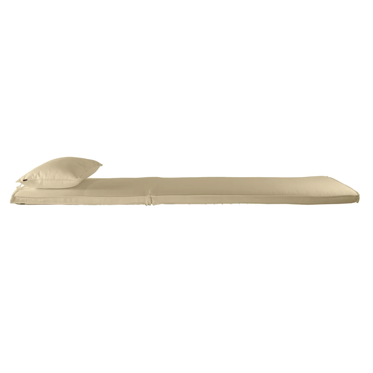 Le coussin et l'oreiller donnent à la Korfu La chaise longue de Jan Kurtz offre un haut degré de confort supplémentaire. Après tout, le coussin a une épaisseur de 5 cm. Pour maintenir le coussin au bon endroit, il peut être fixé à la tête de lit de la chaise longue.