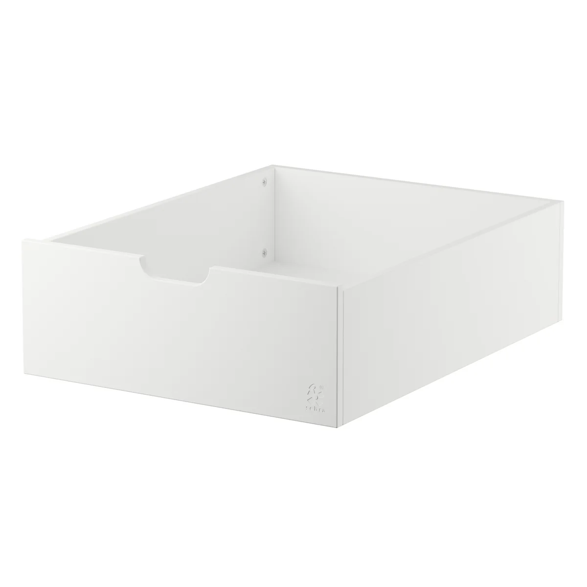Le tiroir de lit est fabriqué en MDF. Grâce à une poignée arrondie et évidée au milieu du tiroir, celui-ci est facile à manipuler. Lorsque le lit Sebra se transforme en lit junior, il y a de la place pour deux tiroirs sous le lit.