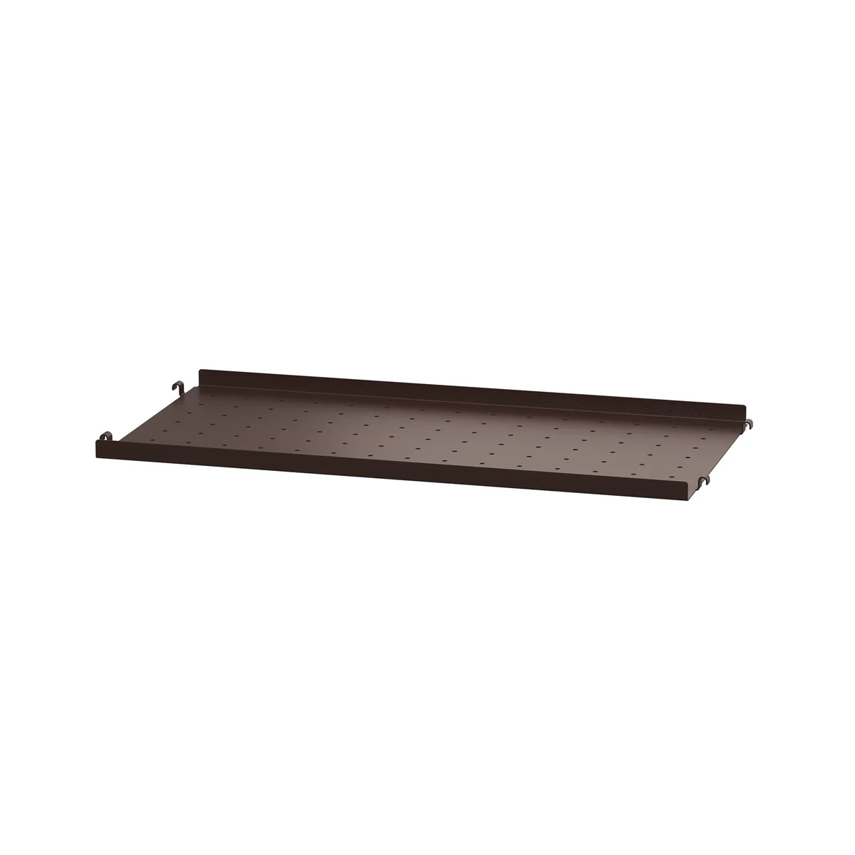 Les étagères métalliques sont particulièrement pratiques lorsque le système d'étagères String se transforme en portemanteau mural dans le couloir. Les chapeaux et les écharpes peuvent être placés sur les étagères, tandis que le fond perforé permet d'accrocher des crochets et des barres pour suspendre des vestes, des parapluies, des sacs, des manteaux et des cintres. Un porte-chaussures en métal perforé est également disponible pour compléter la garde-robe.