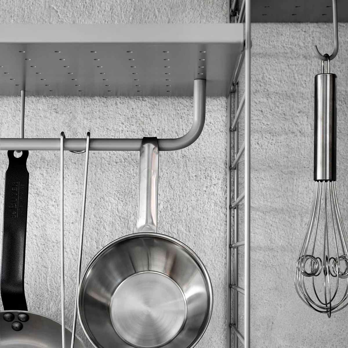 La barre de String se transforme en portemanteau grâce aux pratiques tablettes métalliques de String, qui permettent de suspendre sacs, vestes, parapluies et manteaux à de nombreux cintres. La tringle est particulièrement pratique lorsque le système String est utilisé comme portemanteau dans le couloir ou la chambre à coucher, mais elle est également très pratique dans la cuisine ou la salle de bain. Les serviettes ou les ustensiles de cuisine peuvent ainsi être facilement suspendus sous les étagères.