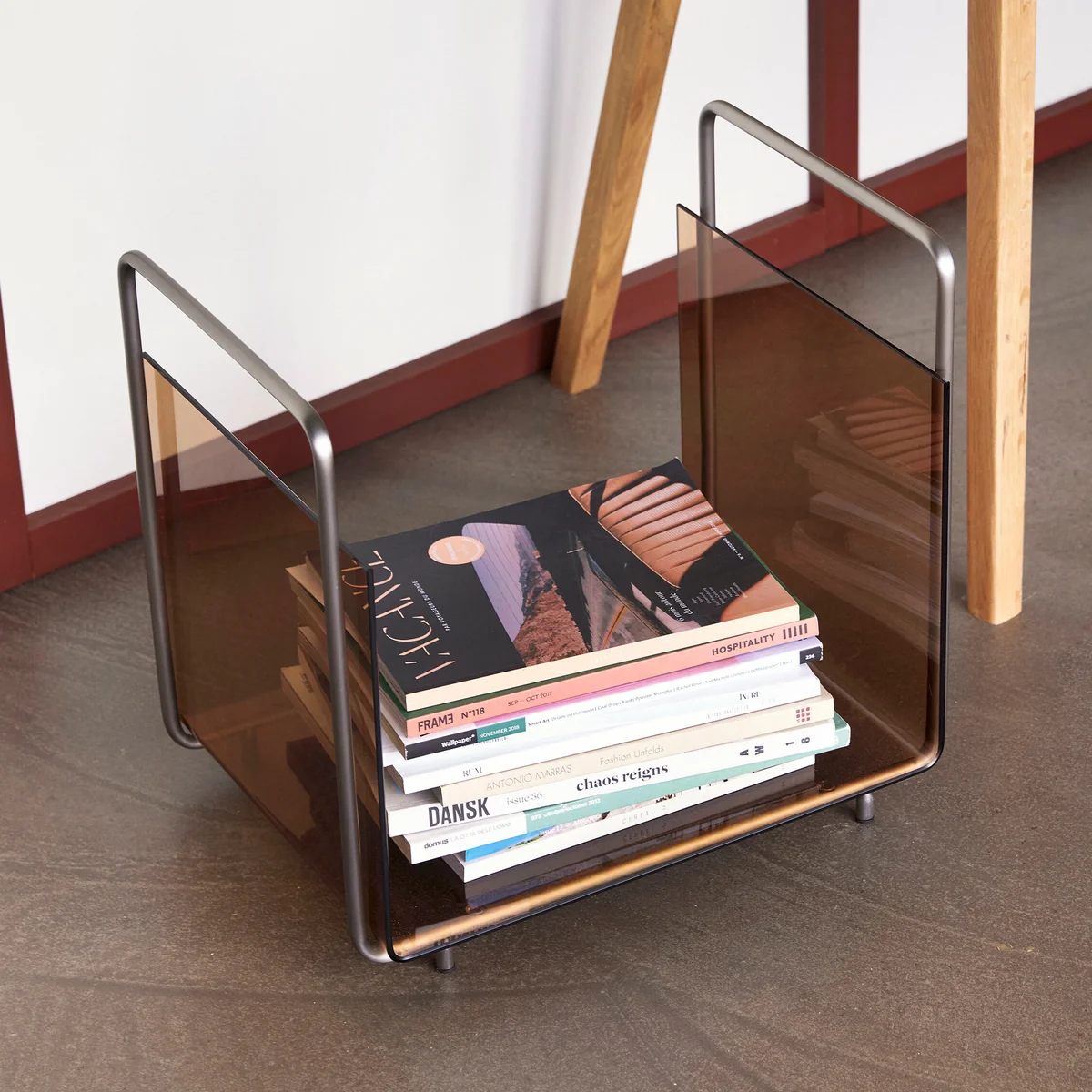 Le porte-revues de Hübsch Interior est un porte-revues pratique qui non seulement donne des accents chics, mais permet aussi de gagner beaucoup d'espace ! Que ce soit dans le salon, le couloir ou à côté du lit, dans la salle de bains ou même dans la cuisine, le porte-revues au look élégant de verre fumé ambré peut même être utilisé dans les salles d'attente et les cafés. Le cadre est en acier nickelé, le compartiment est en verre.