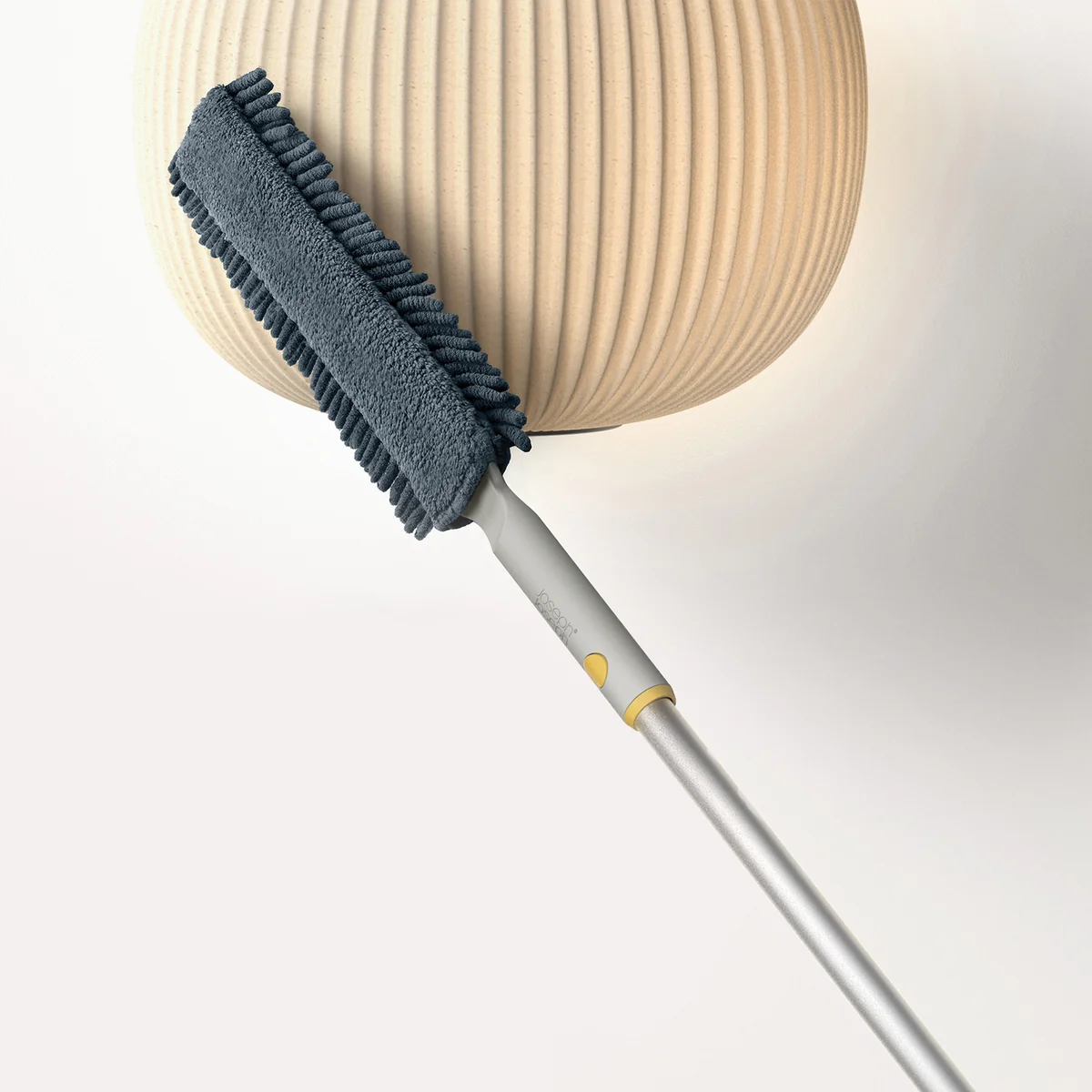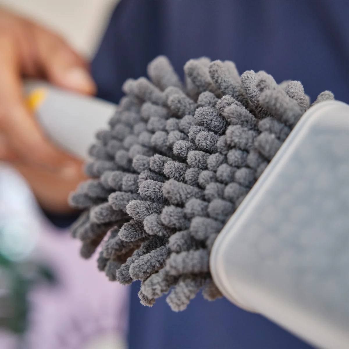 Ce plumeau innovant combine deux faces de nettoyage très efficaces en une seule : une face en microfibres fines pour les surfaces lisses et une face en nouille structurée pour les surfaces irrégulières comme les plinthes ou les bords de meubles. L'outil de nettoyage fourni permet d'enlever facilement la poussière et les peluches de la tête du plumeau. La housse de rangement protectrice assure un stockage hygiénique. Pour les endroits difficiles à atteindre, le balai à poussière peut être combiné avec la CleanTech - Perche télescopique .