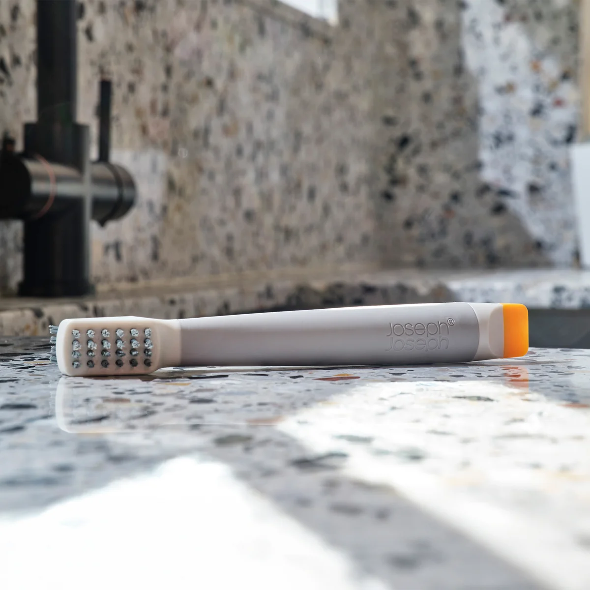 La petite brosse de nettoyage CleanTech combine trois fonctions dans un design compact : des poils plats pour les petites surfaces, des poils en forme de V pour nettoyer les joints et les coins et un grattoir intégré à l'extrémité du manche pour éliminer les dépôts de calcaire et de saleté tenaces. Idéal pour un nettoyage précis dans les zones étroites comme autour des robinets, des joints ou des interstices des appareils de cuisine. La poignée ergonomique et antidérapante offre une prise en main agréable et permet un travail ciblé, même pour les tâches de nettoyage difficiles.