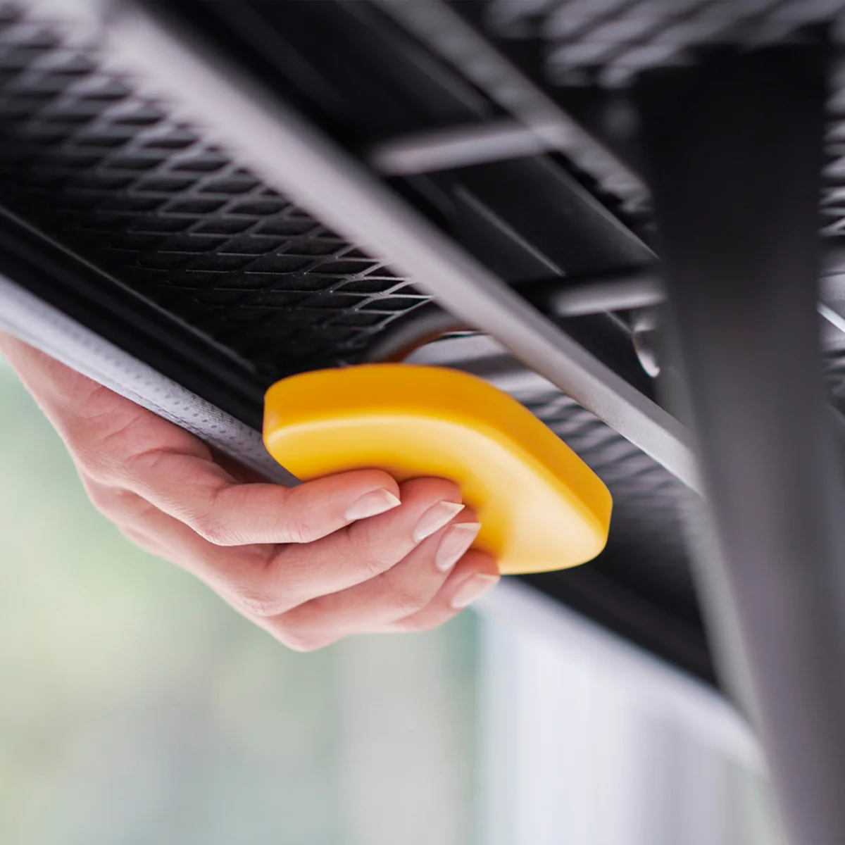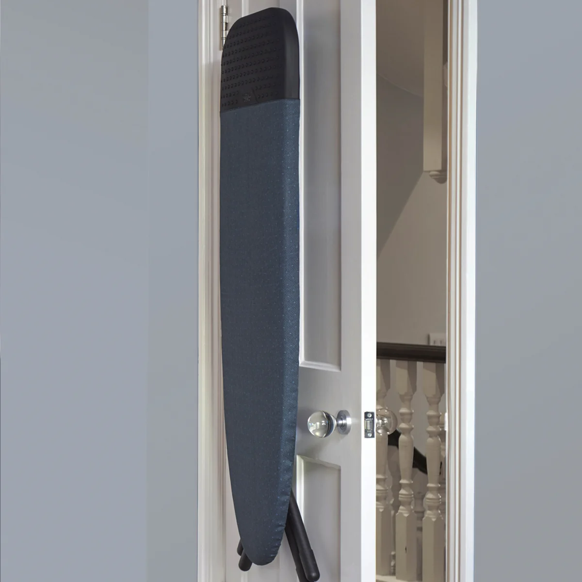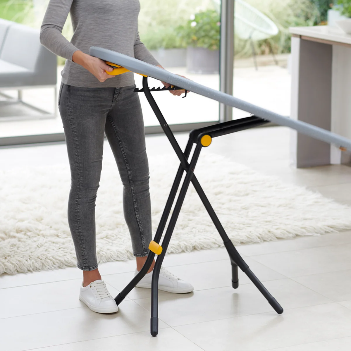 Lorsqu'il est plié, le mécanisme de pliage innovant garantit que les deux pieds à l'extrémité de la planche reposent l'un sur l'autre. Cela réduit le risque de se coincer quelque part en le sortant de l'armoire. Une grande poignée à l'arrière facilite également le transport et, en combinaison avec le support intégré, sert de cintre sûr.