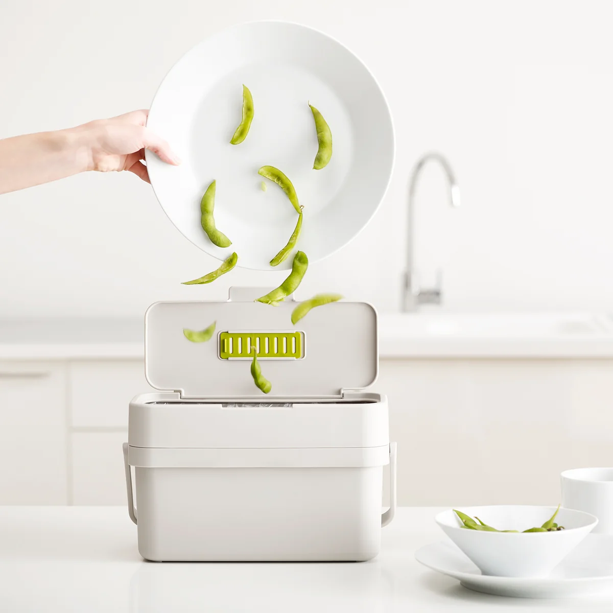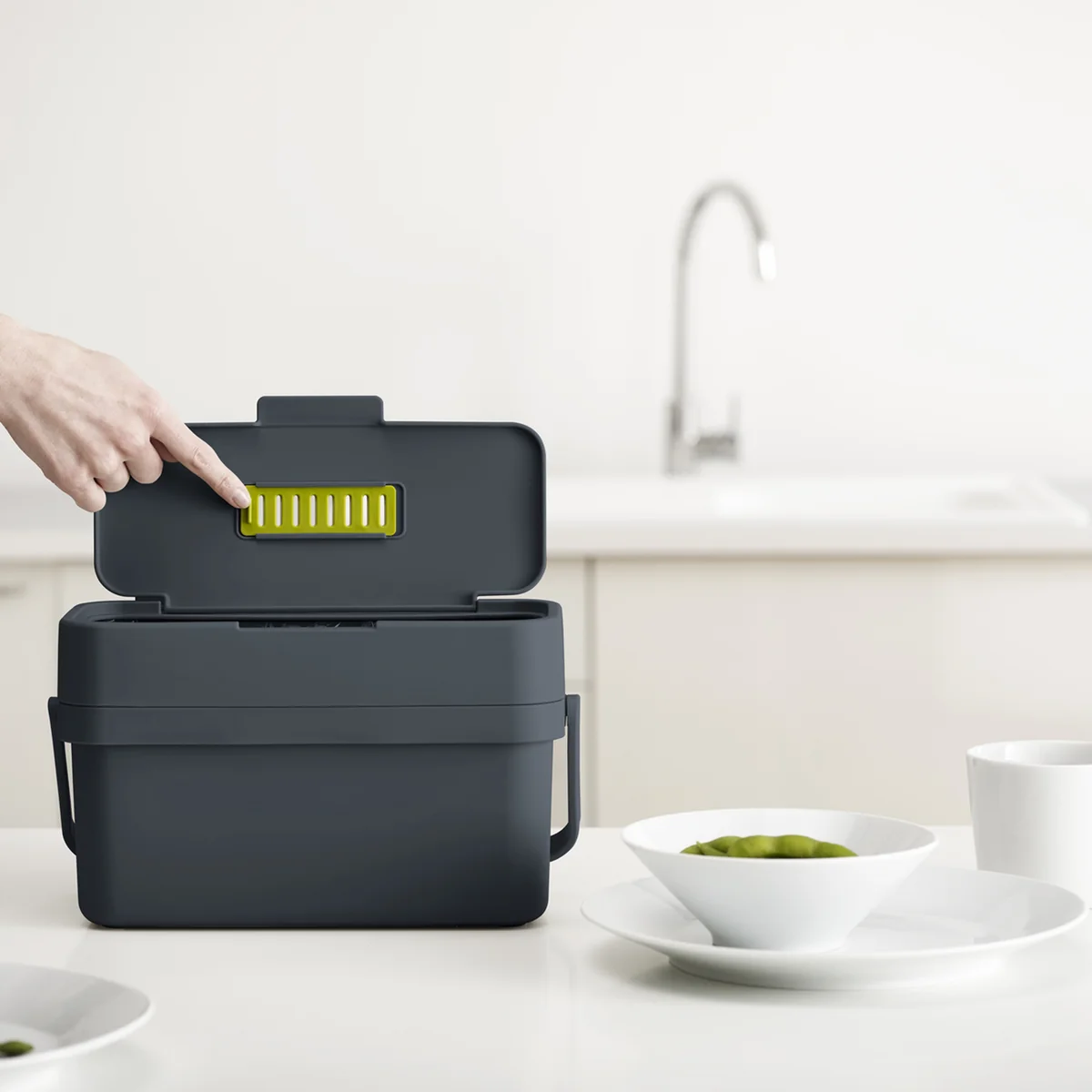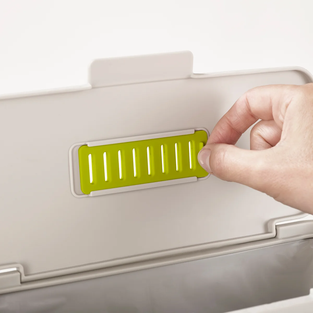 La poubelle à déchets organiques Compo 4 de Joseph Joseph a été spécialement conçue pour l'élimination des déchets alimentaires. Sa forme allongée, son couvercle à charnière pratique et son ouverture extra large sont parfaits pour attraper les restes de nourriture dans les assiettes. Grâce à son design fin, la poubelle d'une capacité de 4 l peut être placée facilement sur le plan de travail ou dans l'armoire de la cuisine. Avec une suspension comprise dans la livraison, la poubelle trouve également une place pratique sur le mur ou à l'intérieur des portes des armoires de cuisine.