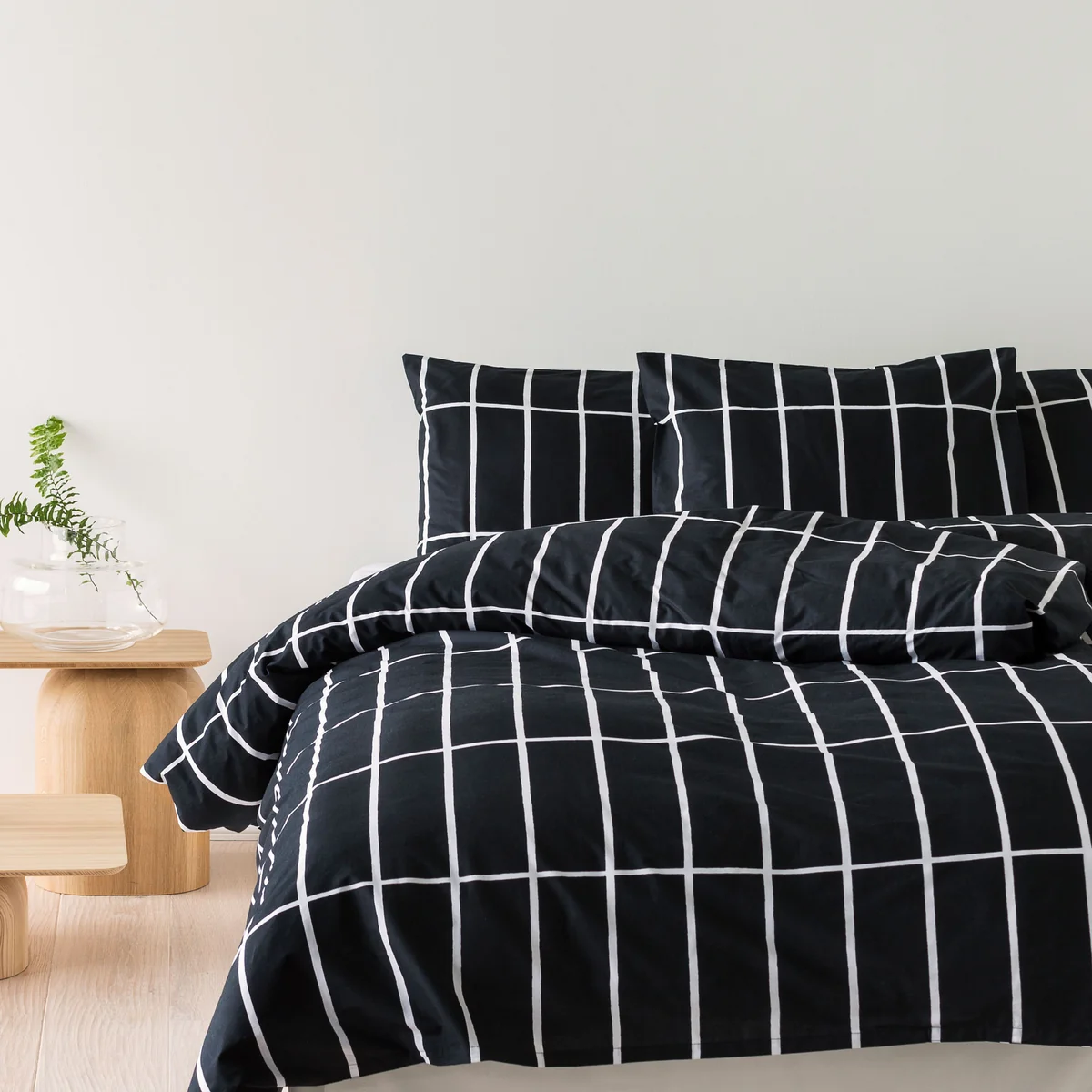 Le linge de lit Tiiliskivi (fin. brique) se caractérise par la combinaison de contrastes et de formes géométriques. Le design intemporel a été créé par la designer Armi Ratia, fondatrice de l'entreprise textile finlandaise Marimekko .