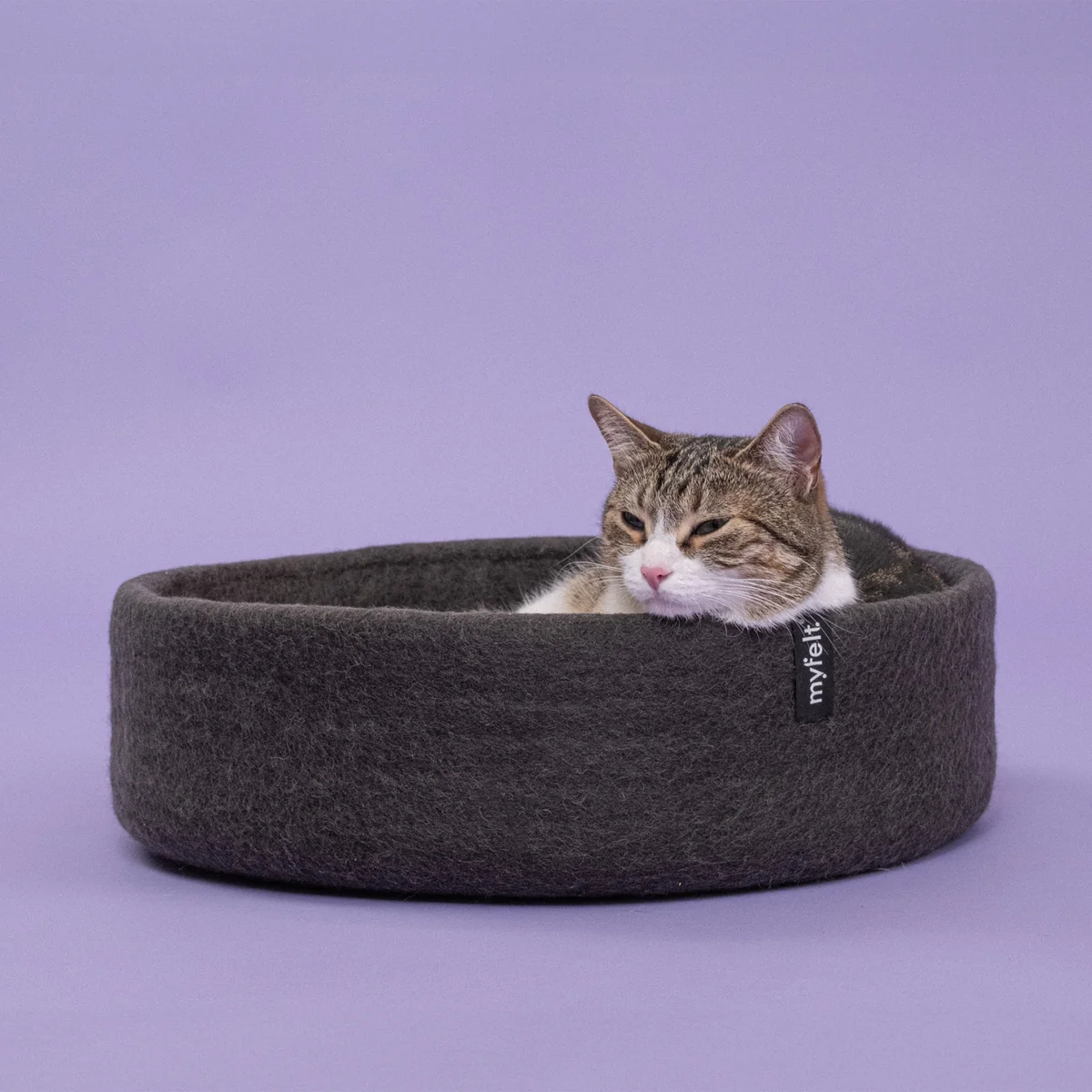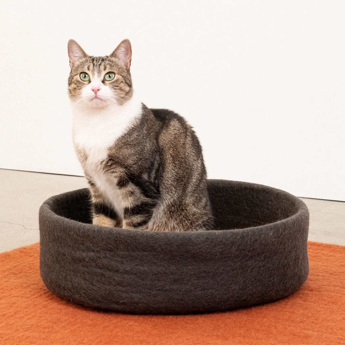 Les chats de toutes tailles se sentent à l'aise et en sécurité dans le panier pour chat en pure laine vierge Kuno, fabriqué à la main par myfelt . Grâce à la graisse naturelle de la laine, ce matériau durable est facile à entretenir, antibactérien et thermorégulateur. Ainsi, le panier pour chat reste chaud et confortable en hiver, tandis qu'il est agréablement frais en été.