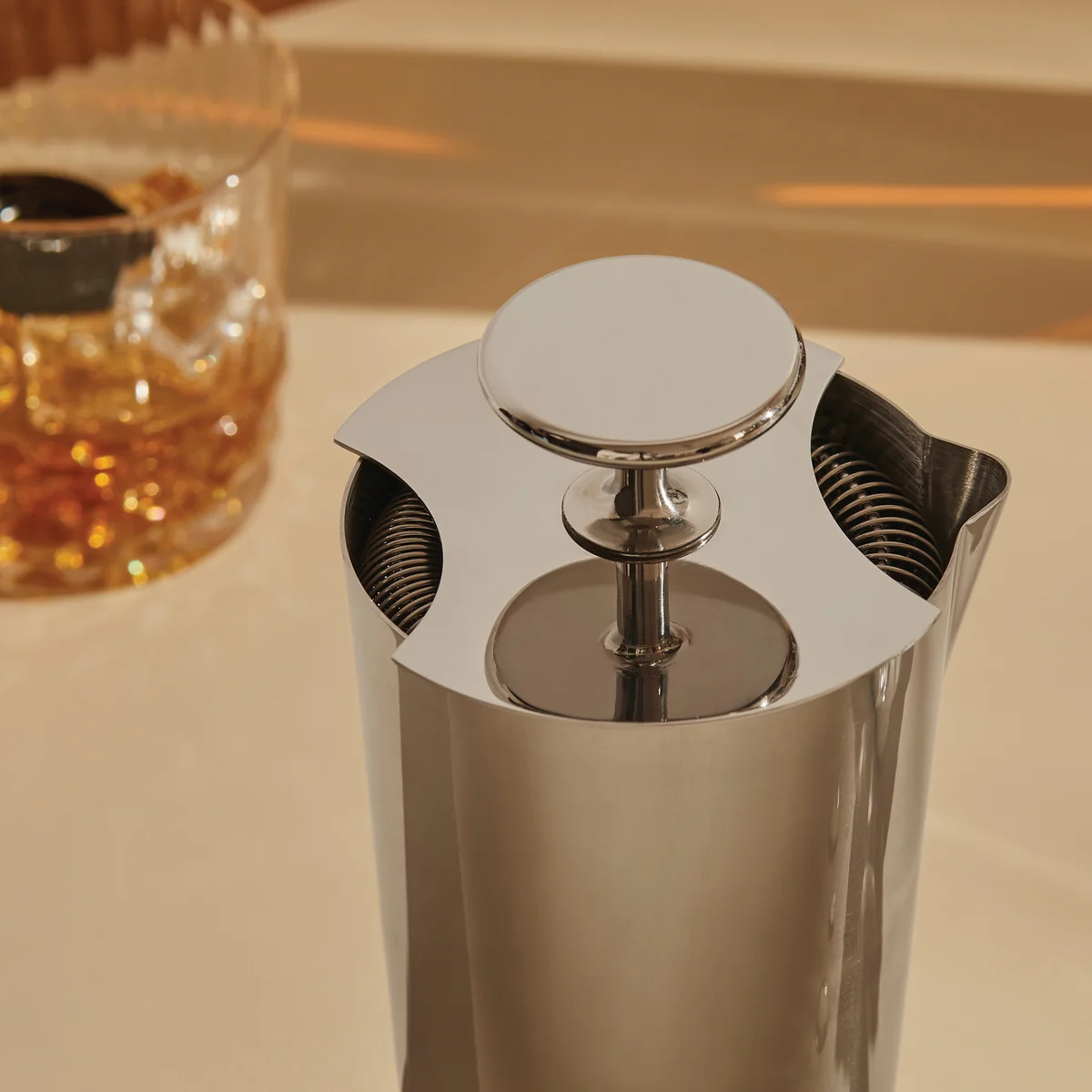 Le The Tending Box Le double tamis de bar de Alessi s'adapte facilement à tous les gobelets mélangeurs ou shakers disponibles dans le commerce. Le tamis est doté de ressorts de différentes densités. La poignée permet de régler la capacité du filtre et de servir ainsi des cocktails à la consistance parfaite et sans grumeaux. Le double tamis de bar convient particulièrement bien comme accessoire complémentaire au The Tending Box Gobelet mélangeur .